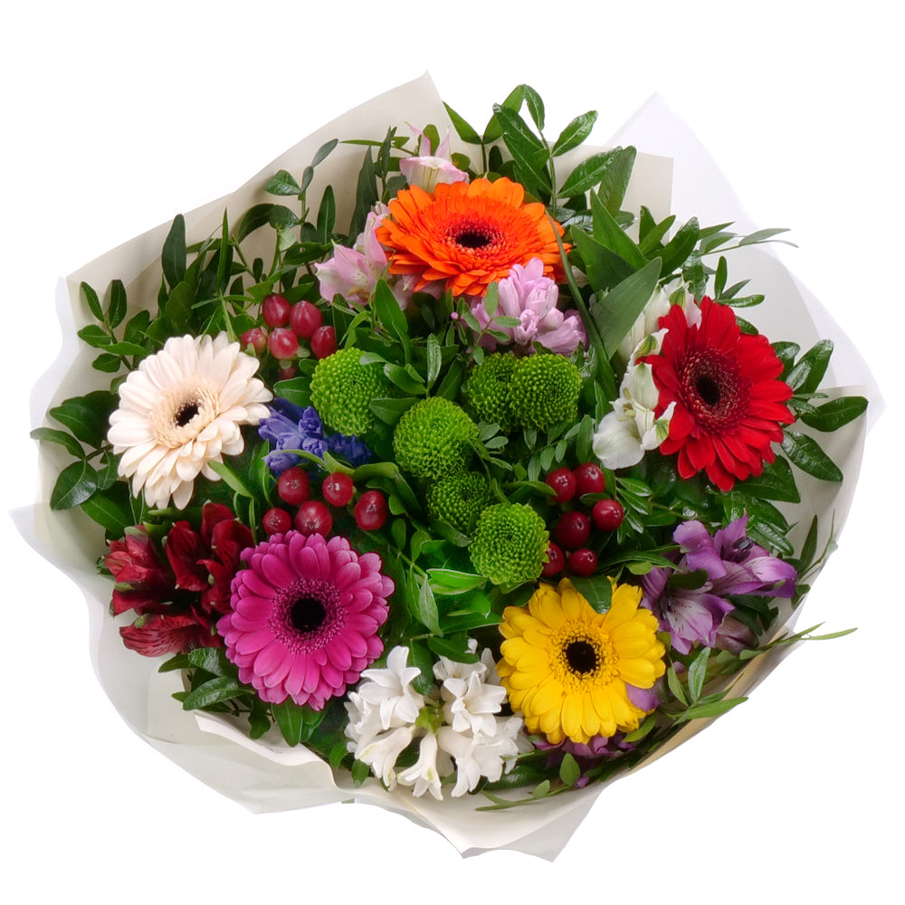 Pestrá jarná kytica z farebných gerbier, alstromérií, hyacintov a santíniek ozdobená dekoratívnym papierom a saténovou stuhou.