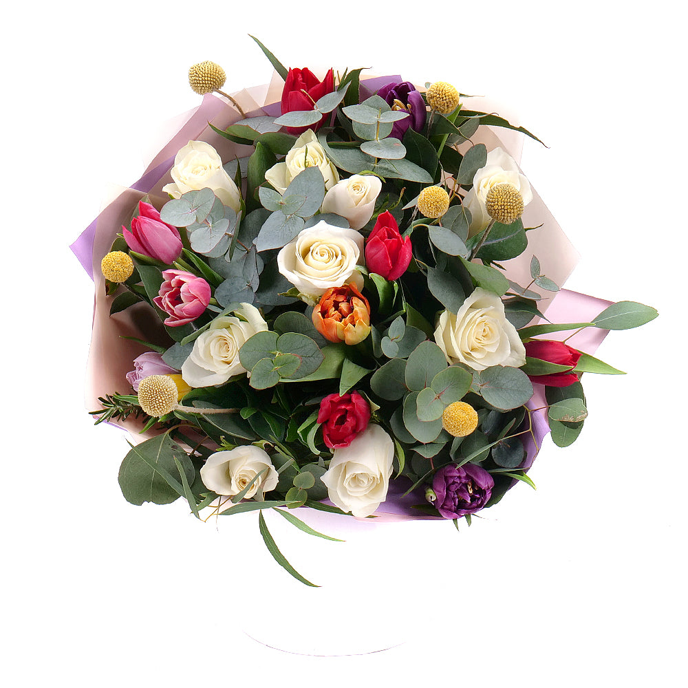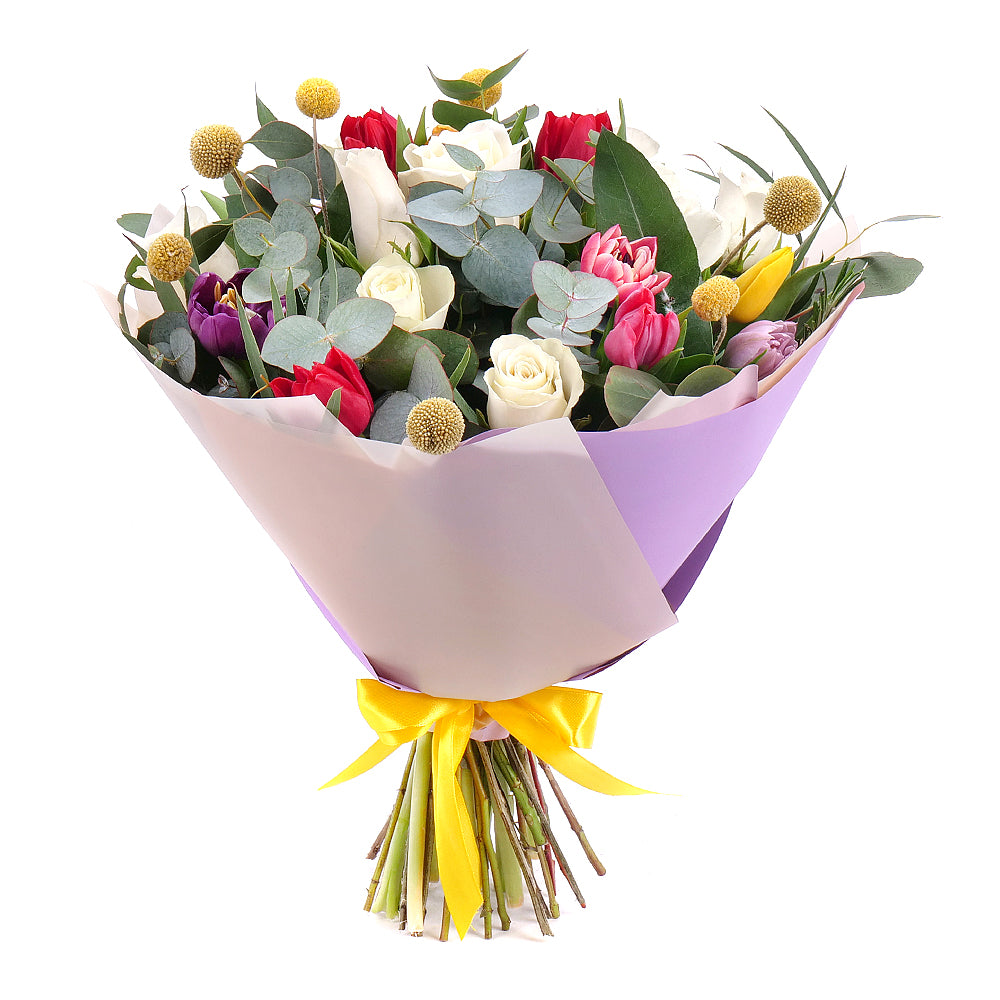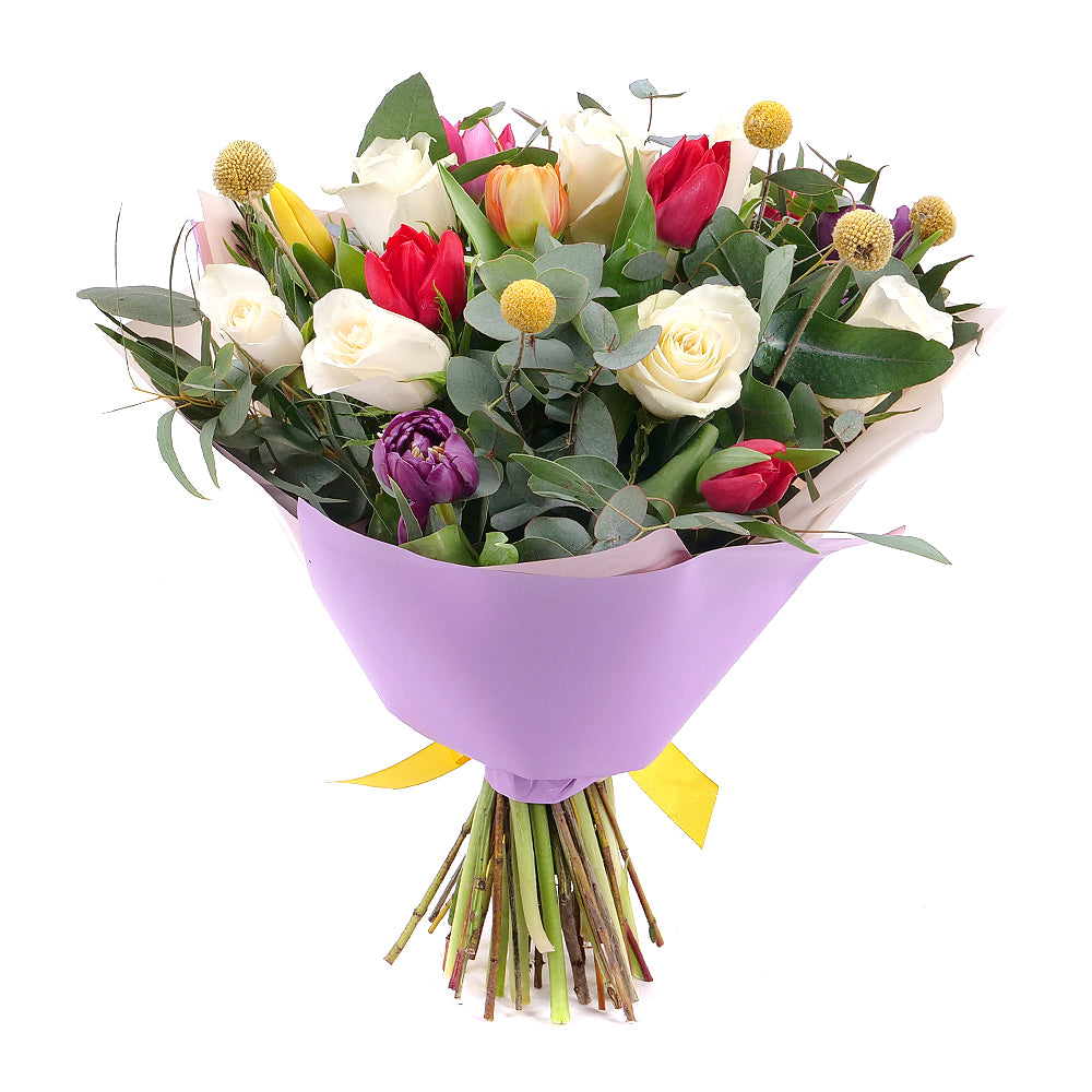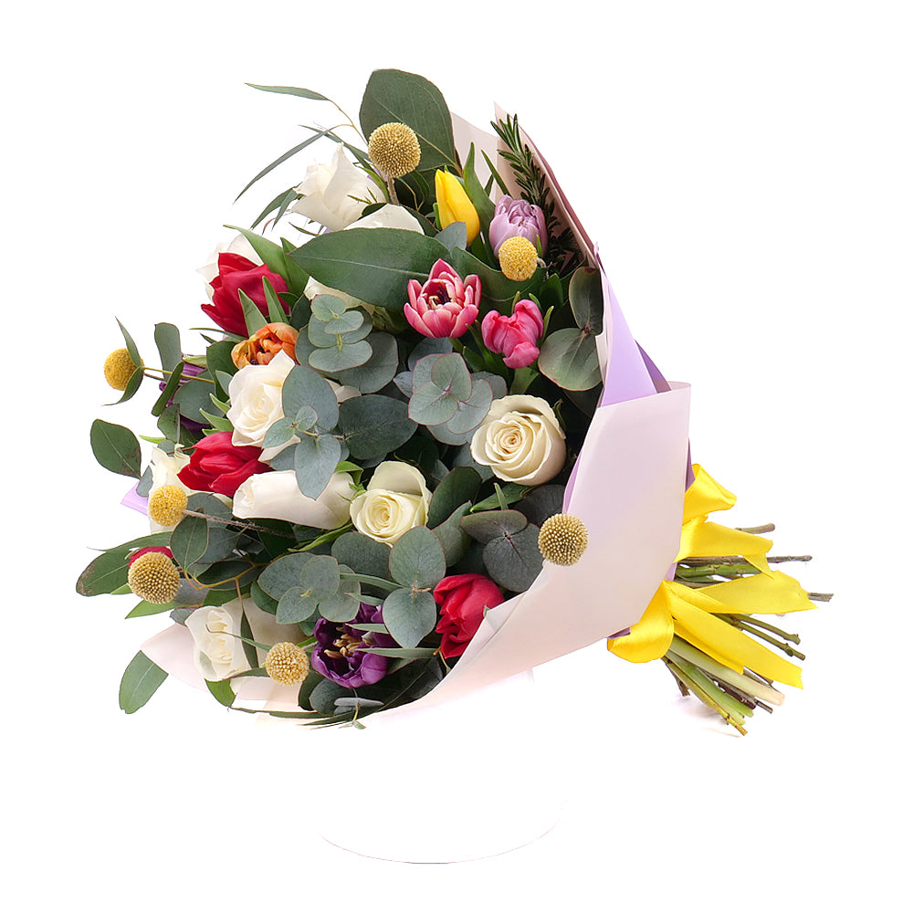 Jarná kytica z tulipánov, ruží a dekoračnej zelene. Kytica je doplnená ozdobným papierom a saténovou stuhou.