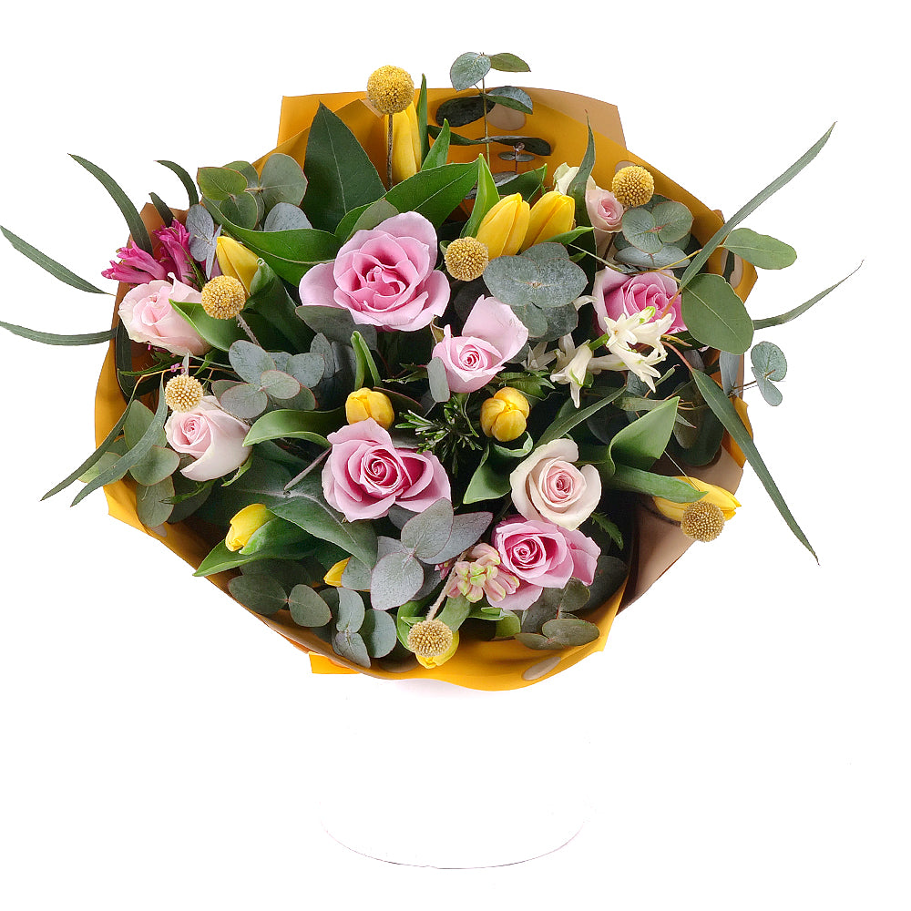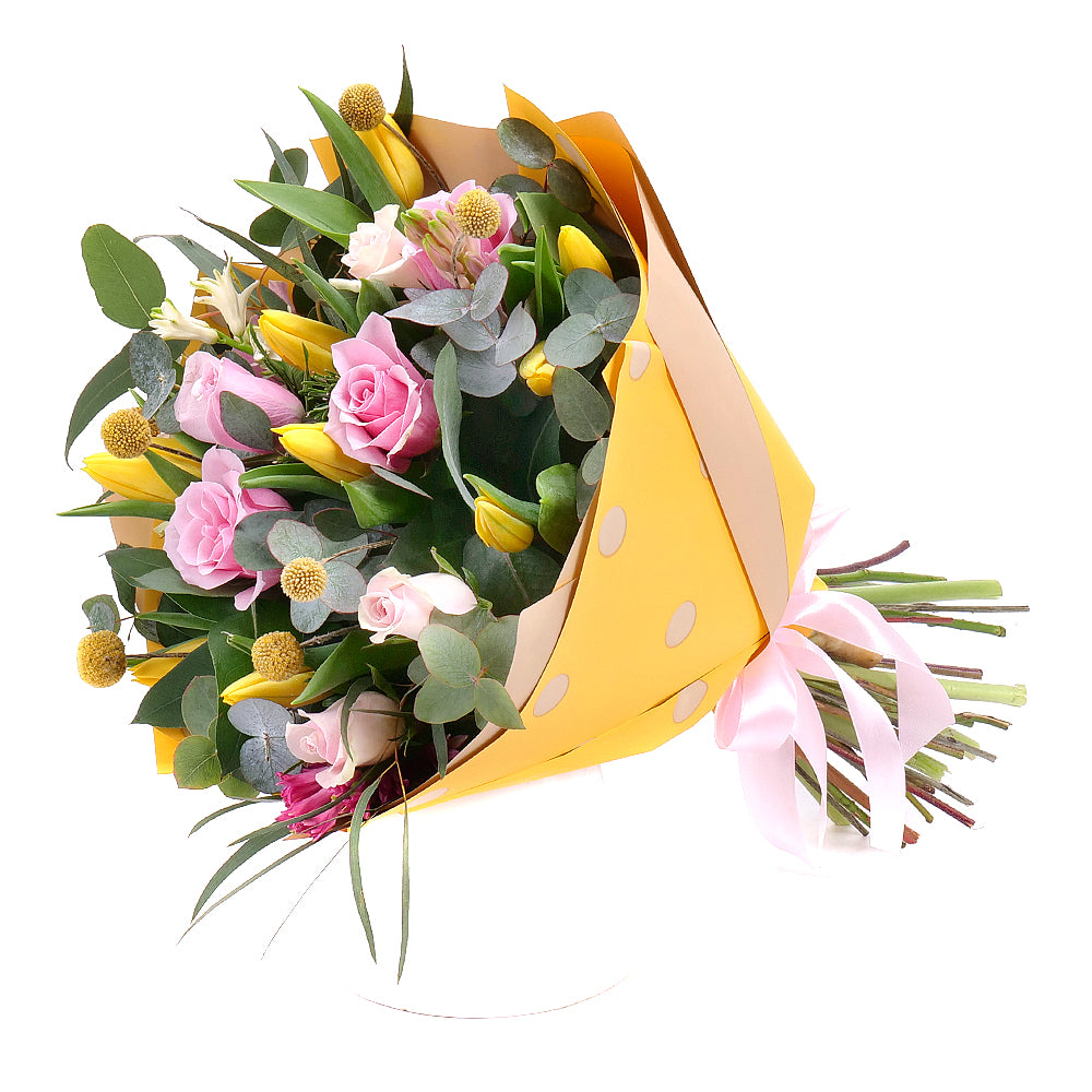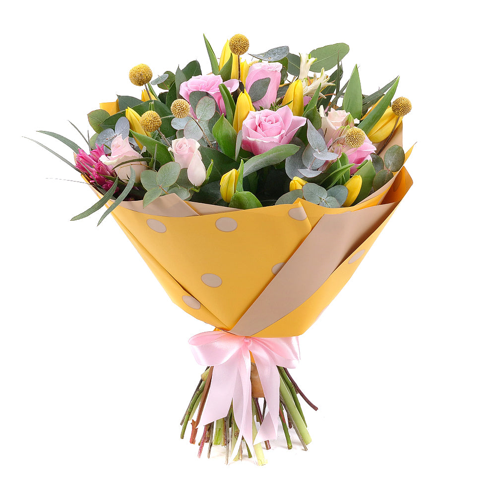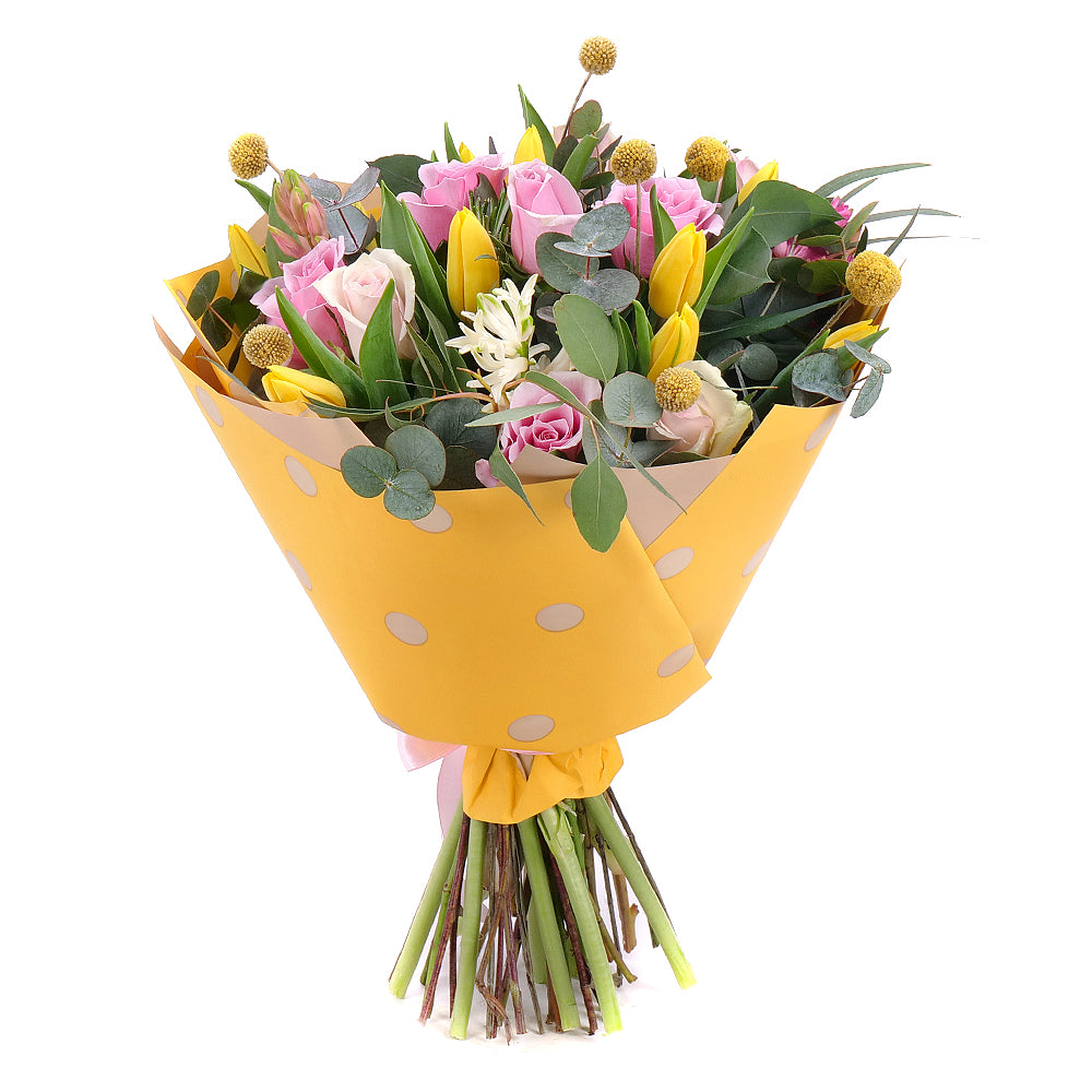 Jarná kytica z ružových ruží, tulipánov a hyacintov. Kytica je doplnená ozdobným papierom a saténovou stuhou.