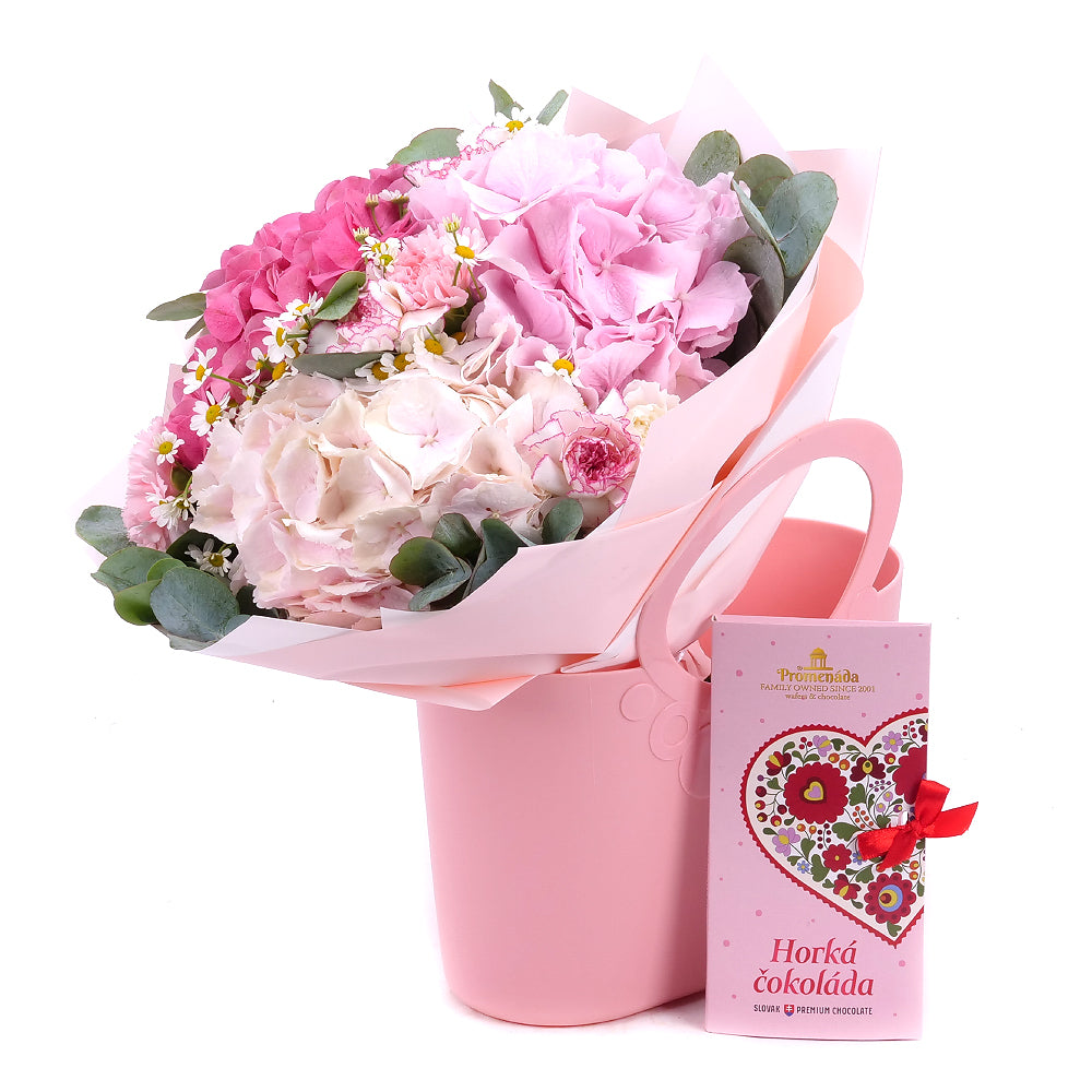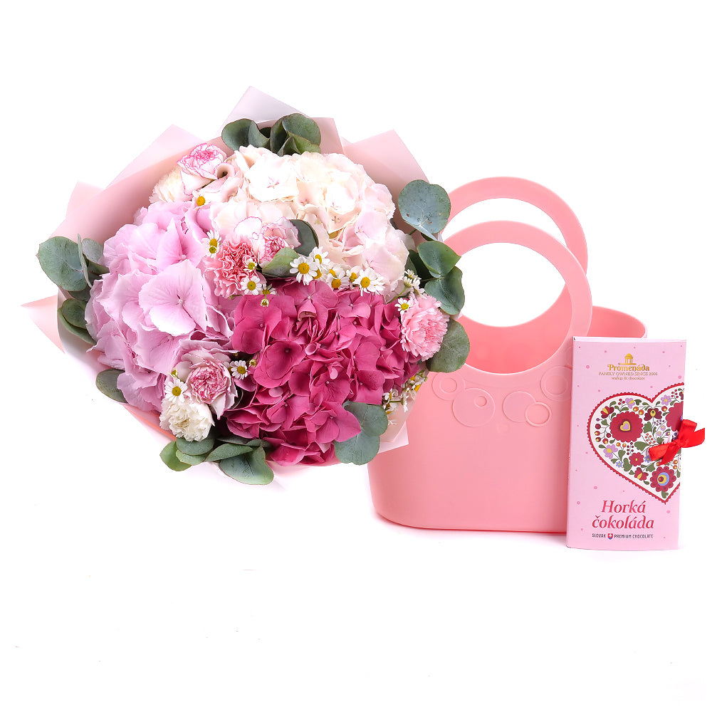 Darčekový set v podobe kytice z hortenzií a karafiátov v dekoračnej plastovej taške s horkou slovenskou čokoládou.