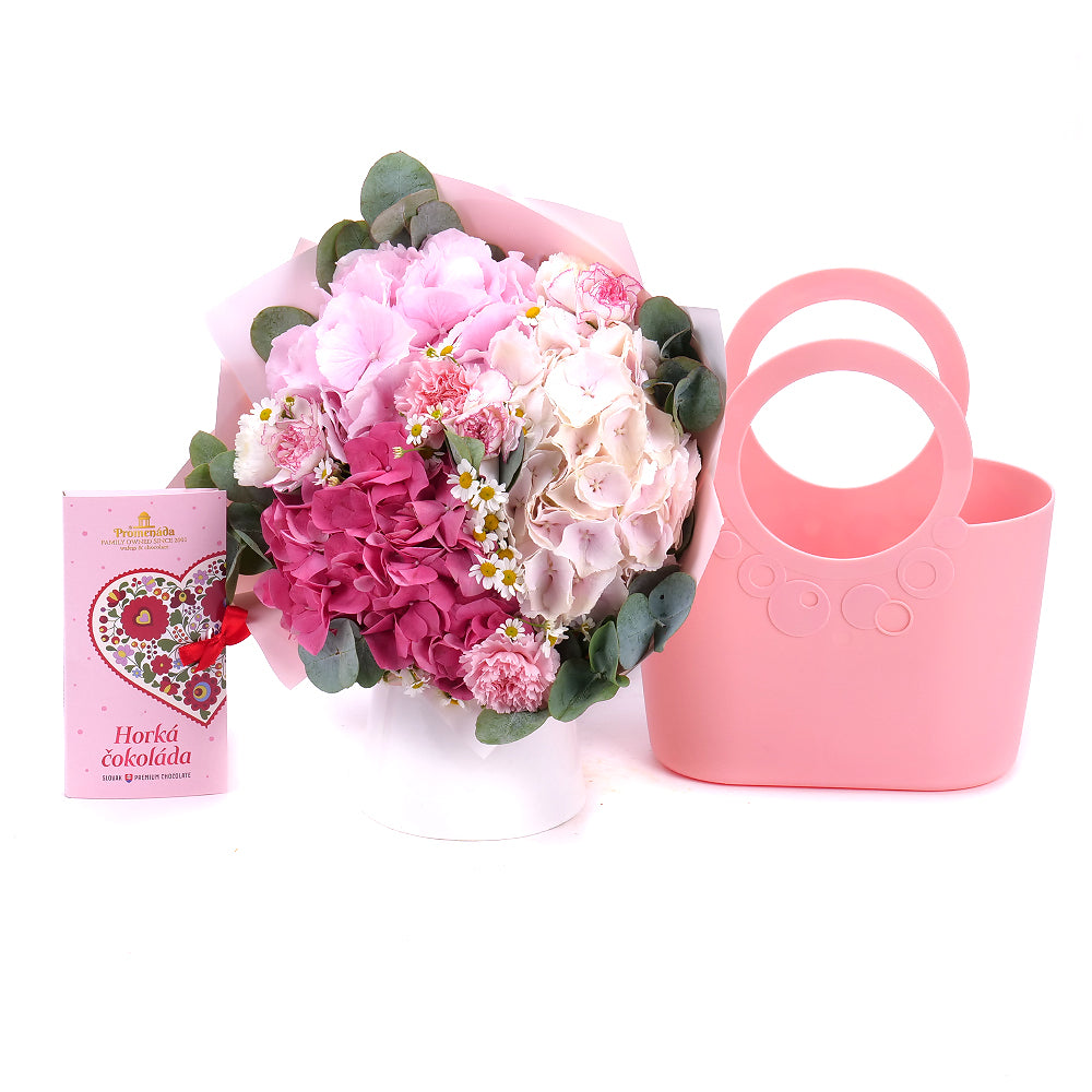 Kvetinová taška Sweet farebné hortenzie, karafiáty a čokoláda