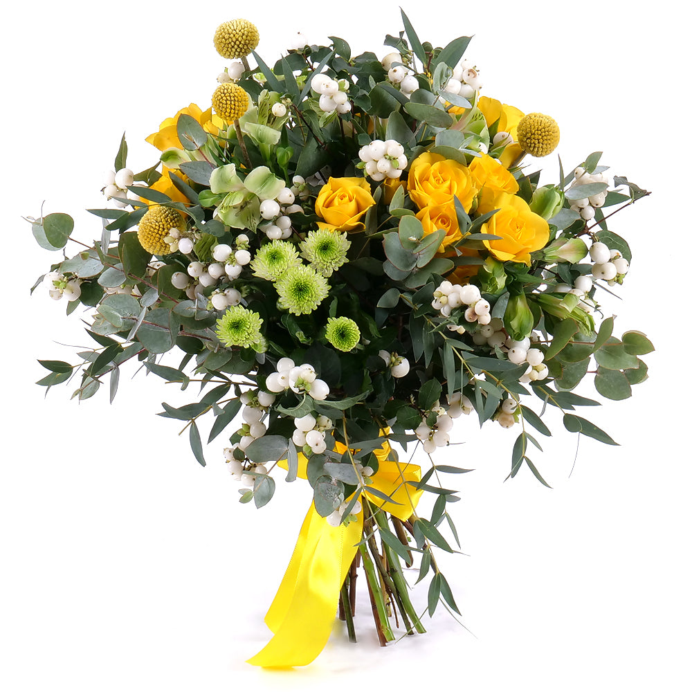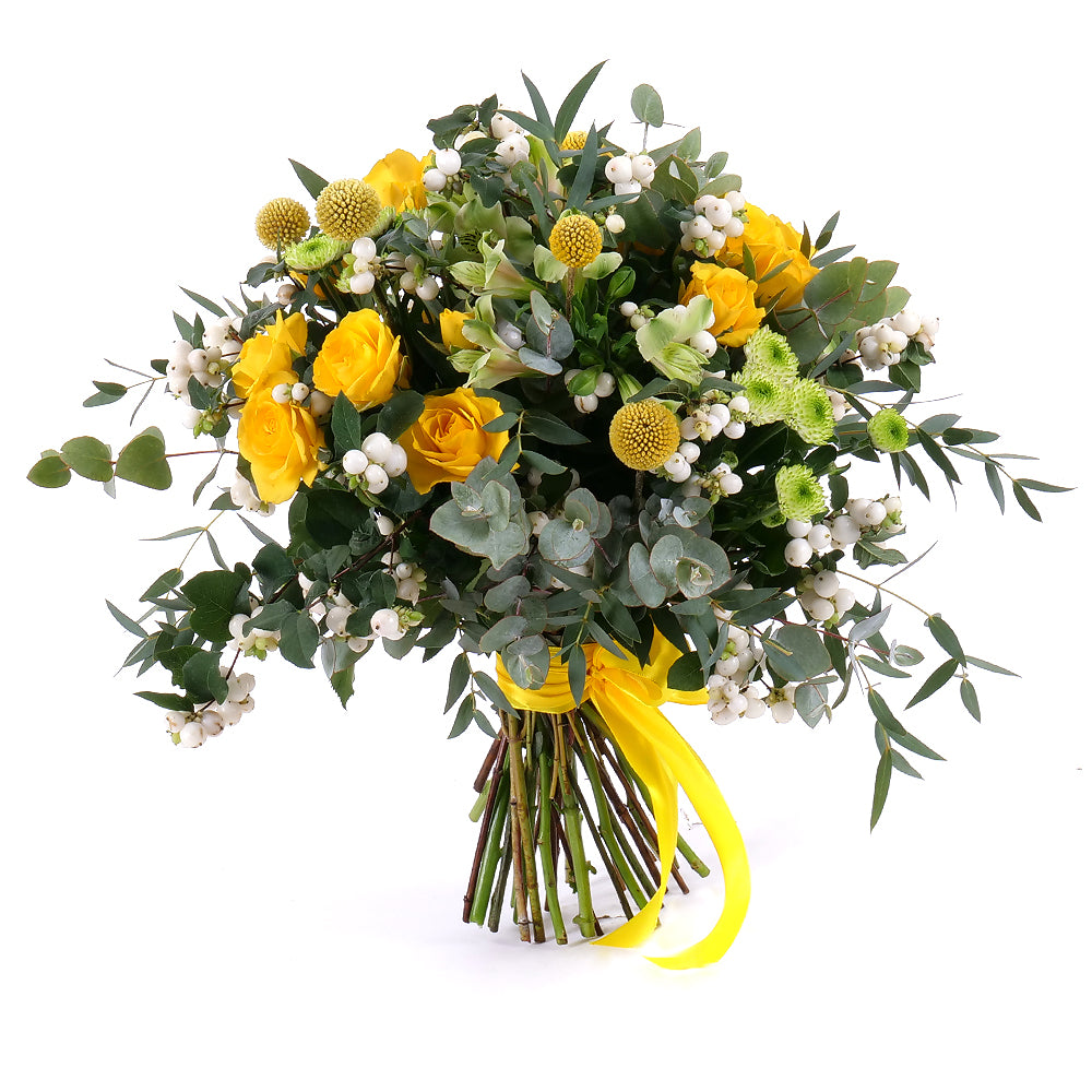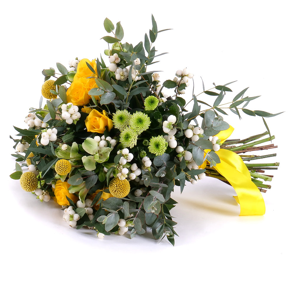 Kytica aranžovaná z trsových ruží, alstromérií, chryzantém a dekoračnej zelene v jemnej žlto bielej kombinácií.