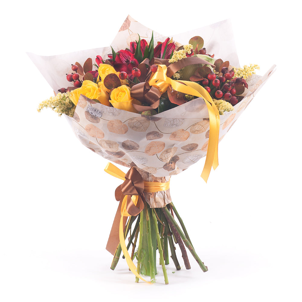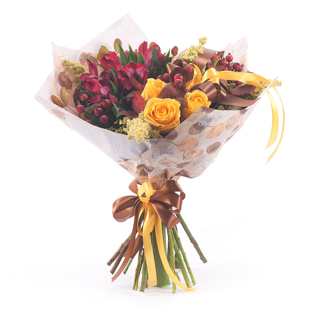 Jesenná kytica zo žltých ruží a červených alstromérií v jesennom papieri s elegantnou žlto-hnedou stuhou.SloženíAmarylis mix rez - 1 ks Čítať viac