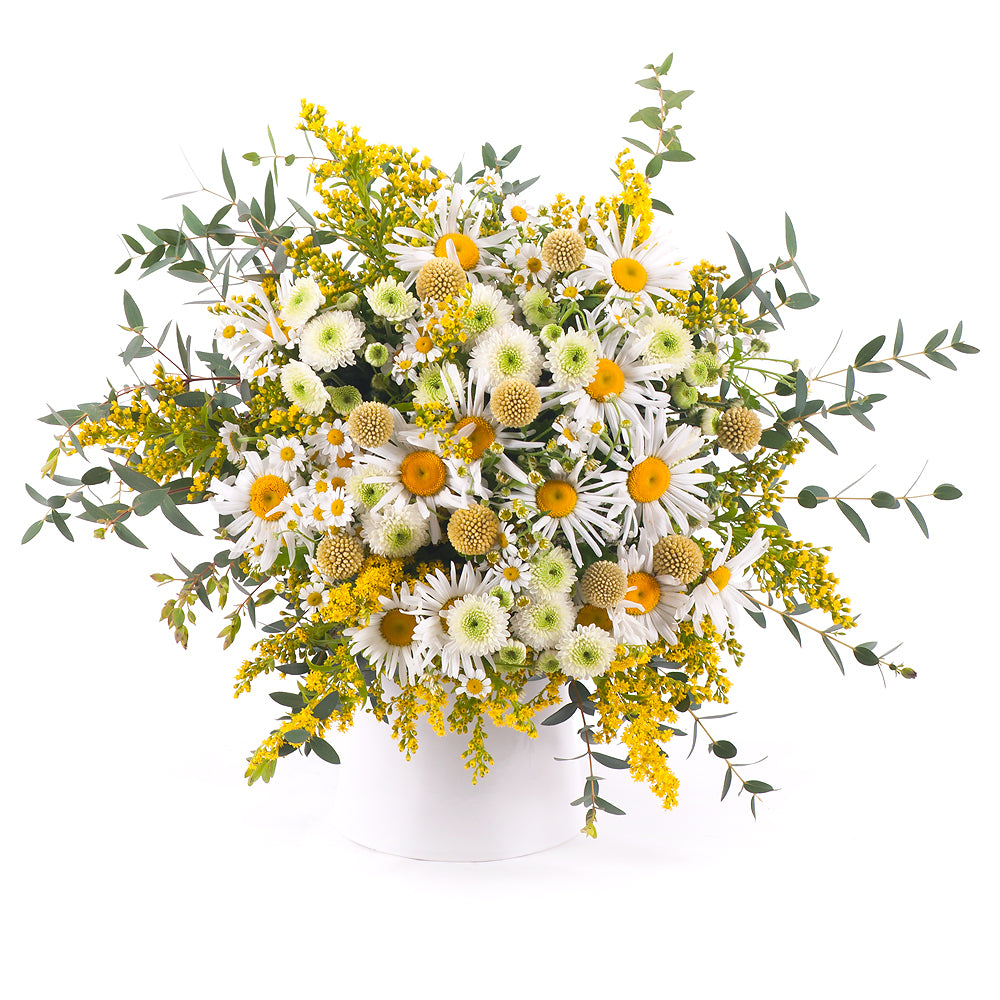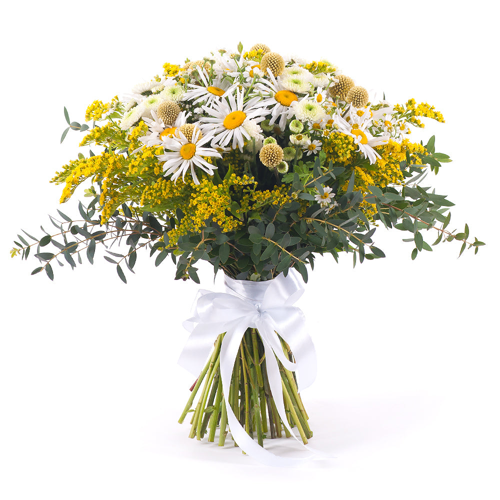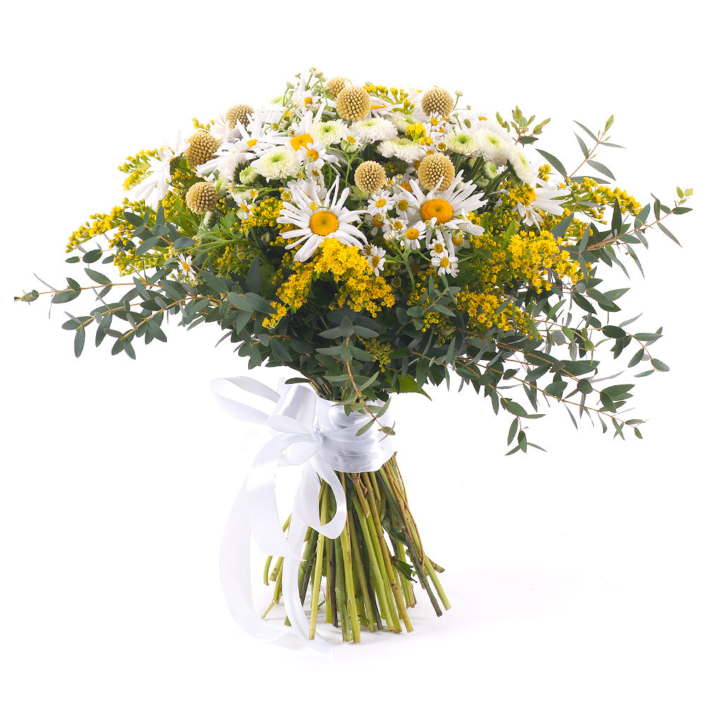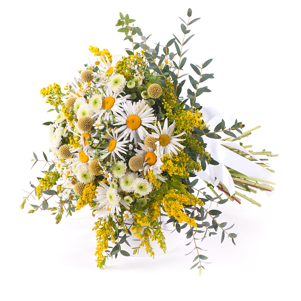 Letná kytica z margarétok, santíniek a krospédie zviazané bielou stuhou.
