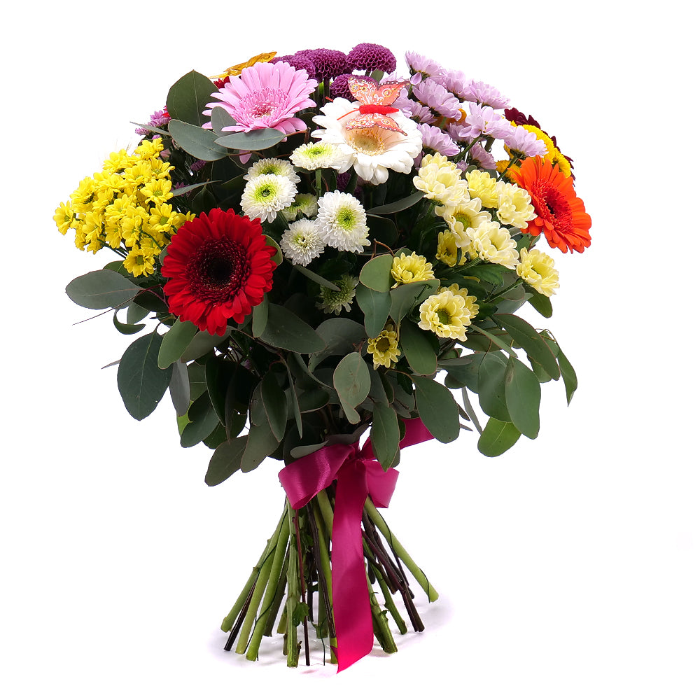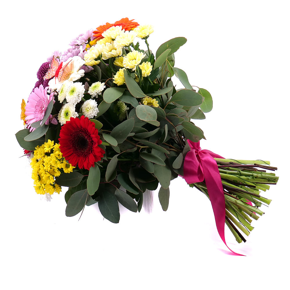 Pestrá letná kytica aranžovaná z gerbier v kombinácií s chryzantémou santínou doplnená dekoračnou zeleňou a saténovou stuhou.