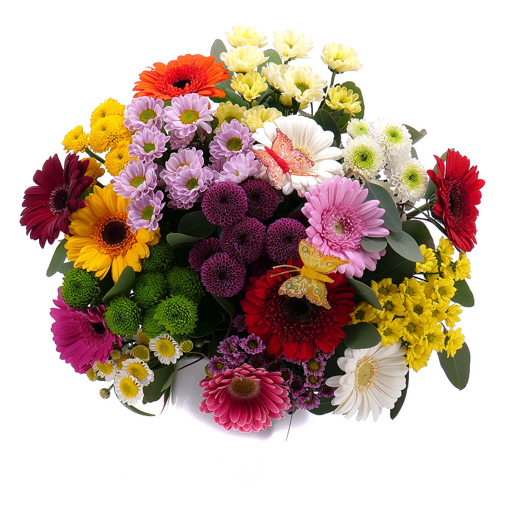 Pestrá letná kytica aranžovaná z gerbier v kombinácií s chryzantémou santínou doplnená dekoračnou zeleňou a saténovou stuhou. Čítať viac