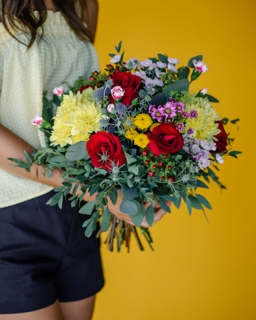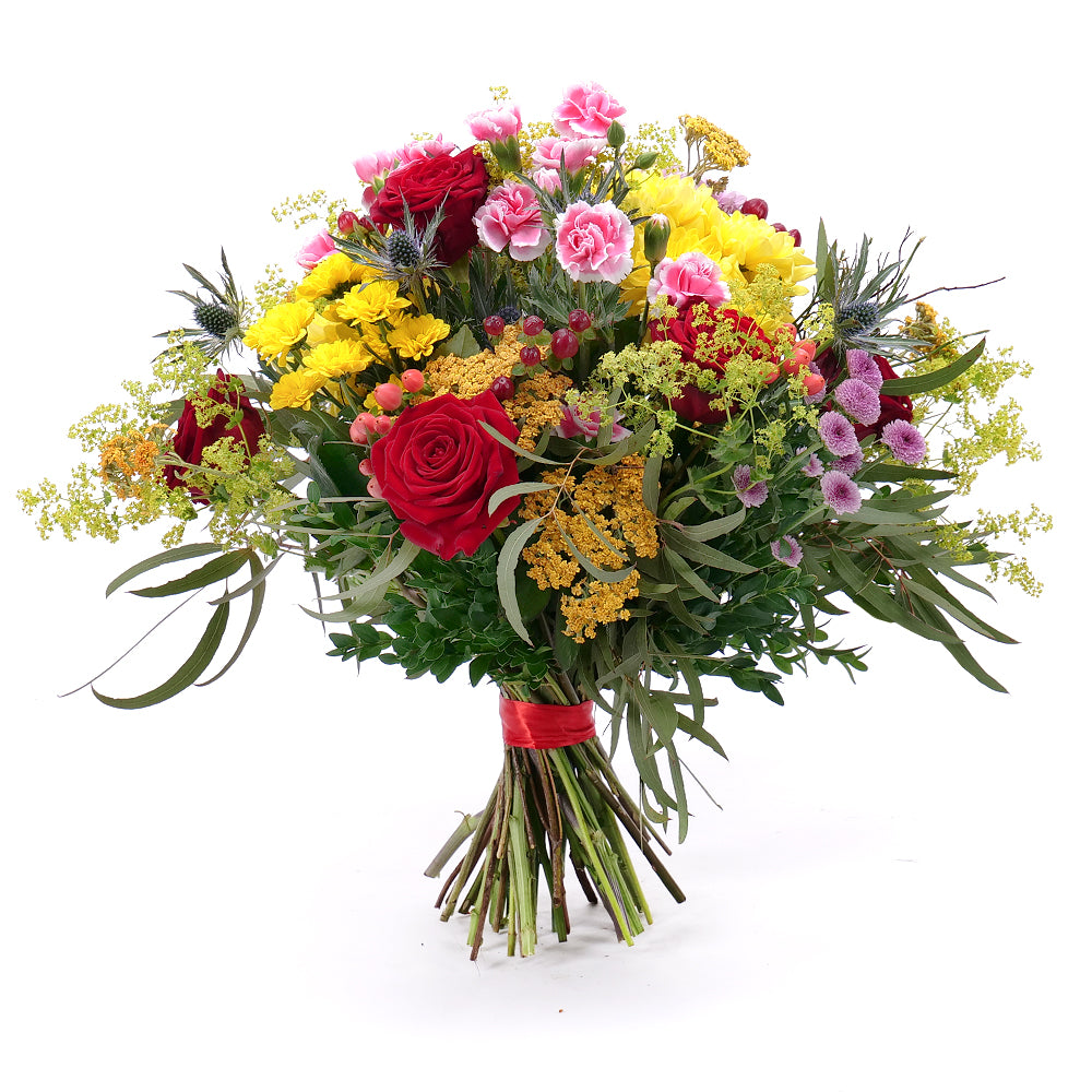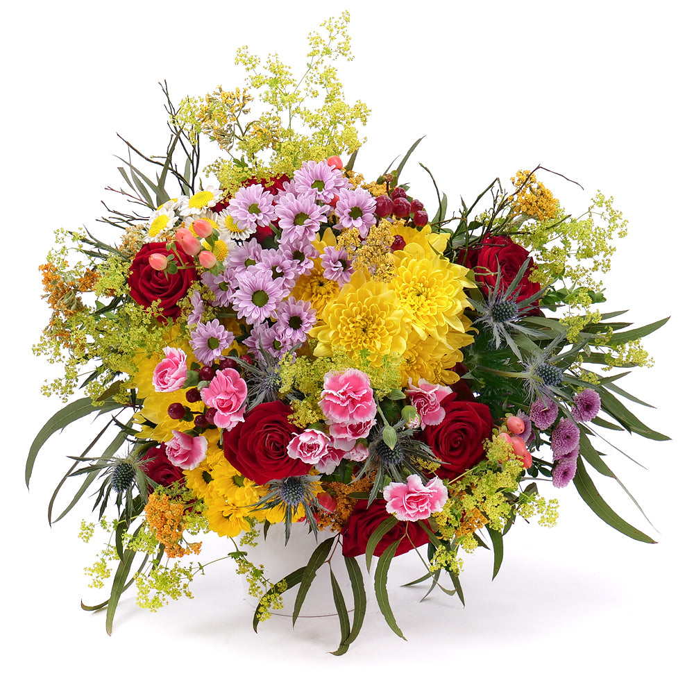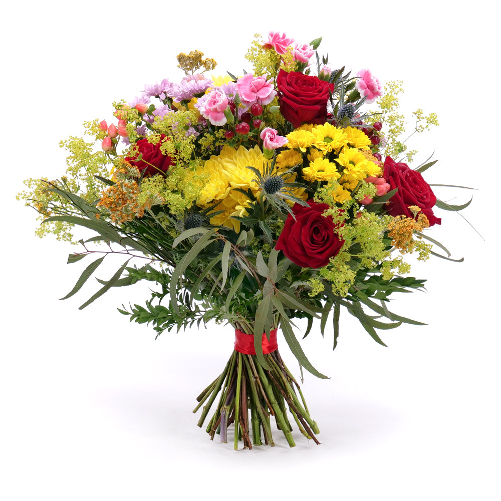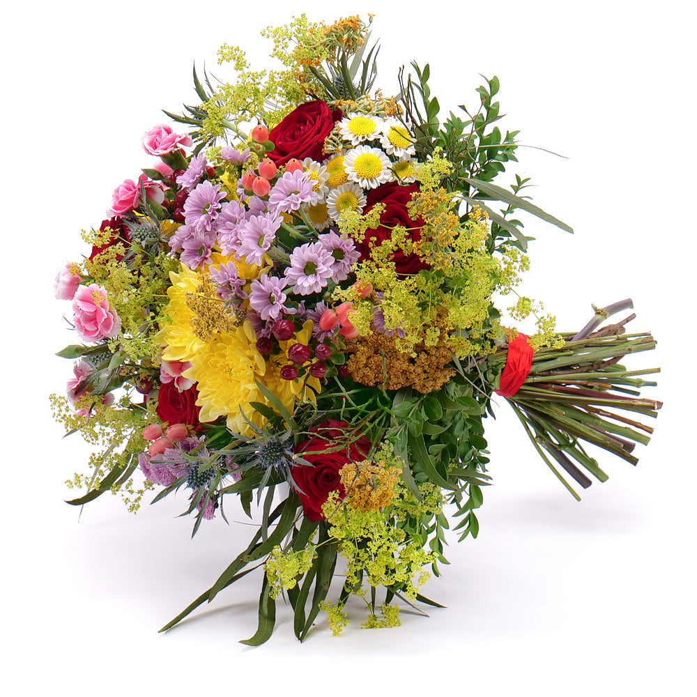 Letná kytica zložená z rôznych druhov kvetov a dekoračnej zelene. Vhodný darček k sviatku alebo len tak pre potešenie.