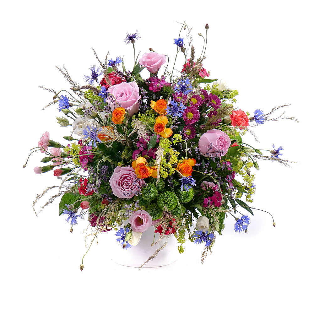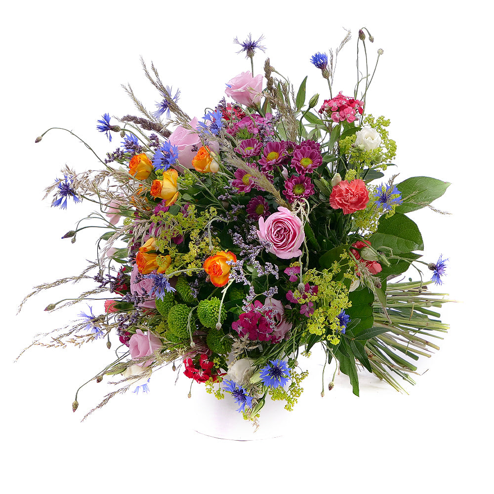 Svieža letná kytica z rôznych druhov kvetov doplnená prírodnými trávami a dekoračnou zeleňou.