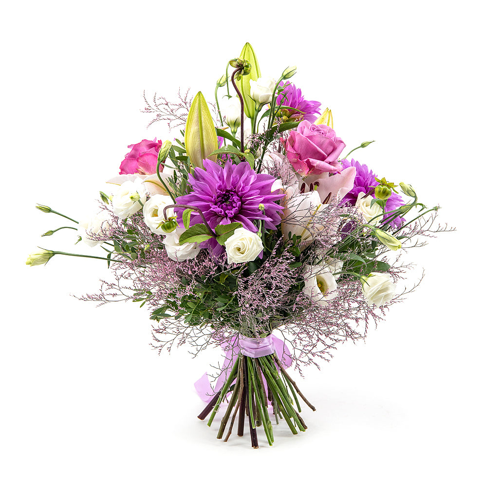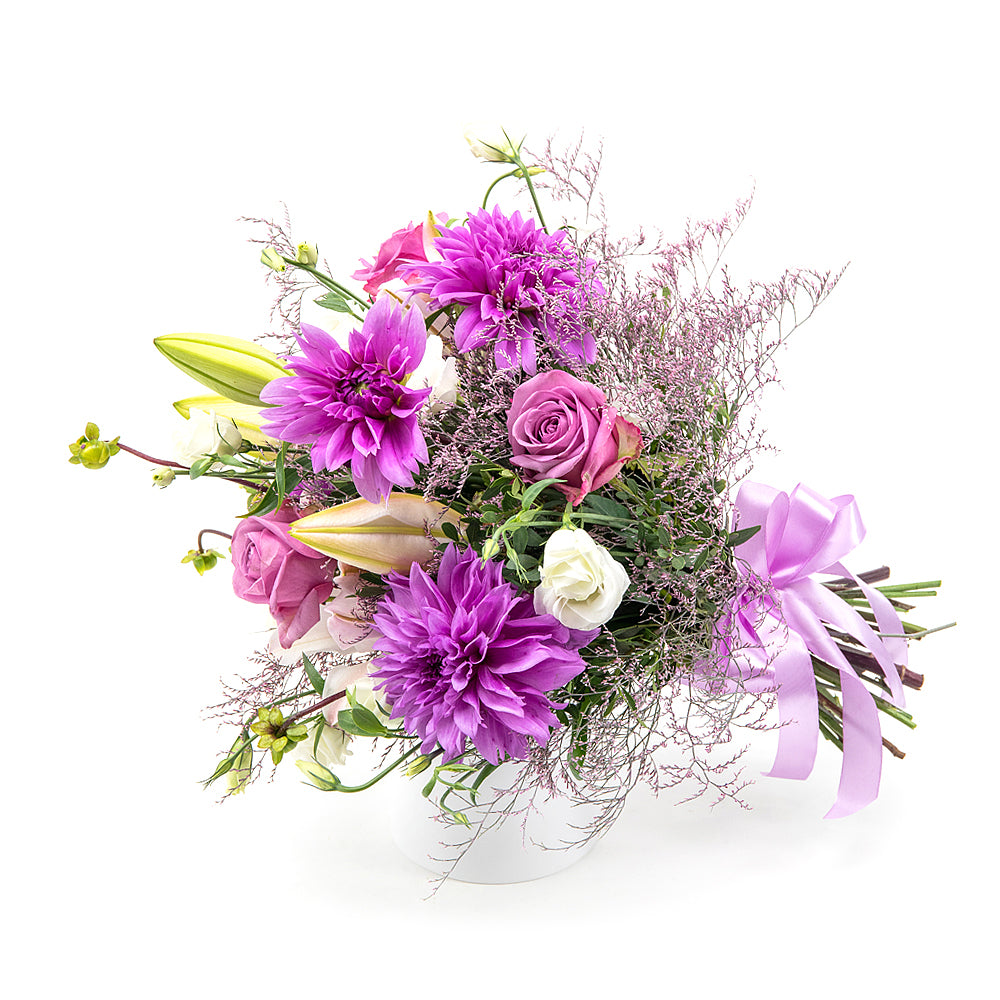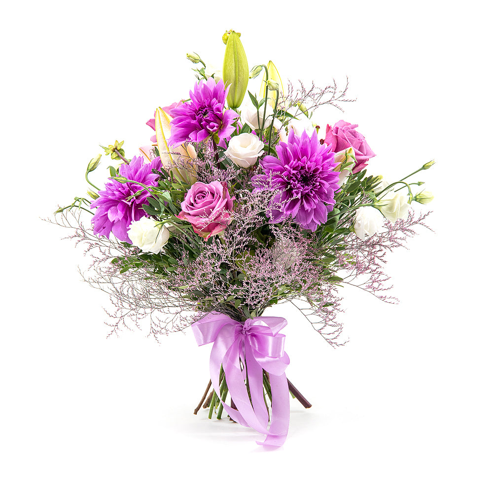 Kytica Letana 7 je svieža kytica aranžovaná z fialových dahlií, lisiantusov, limonky a ľalie doplnená o dekoračnú zeleň a saténovú... Čítať viac