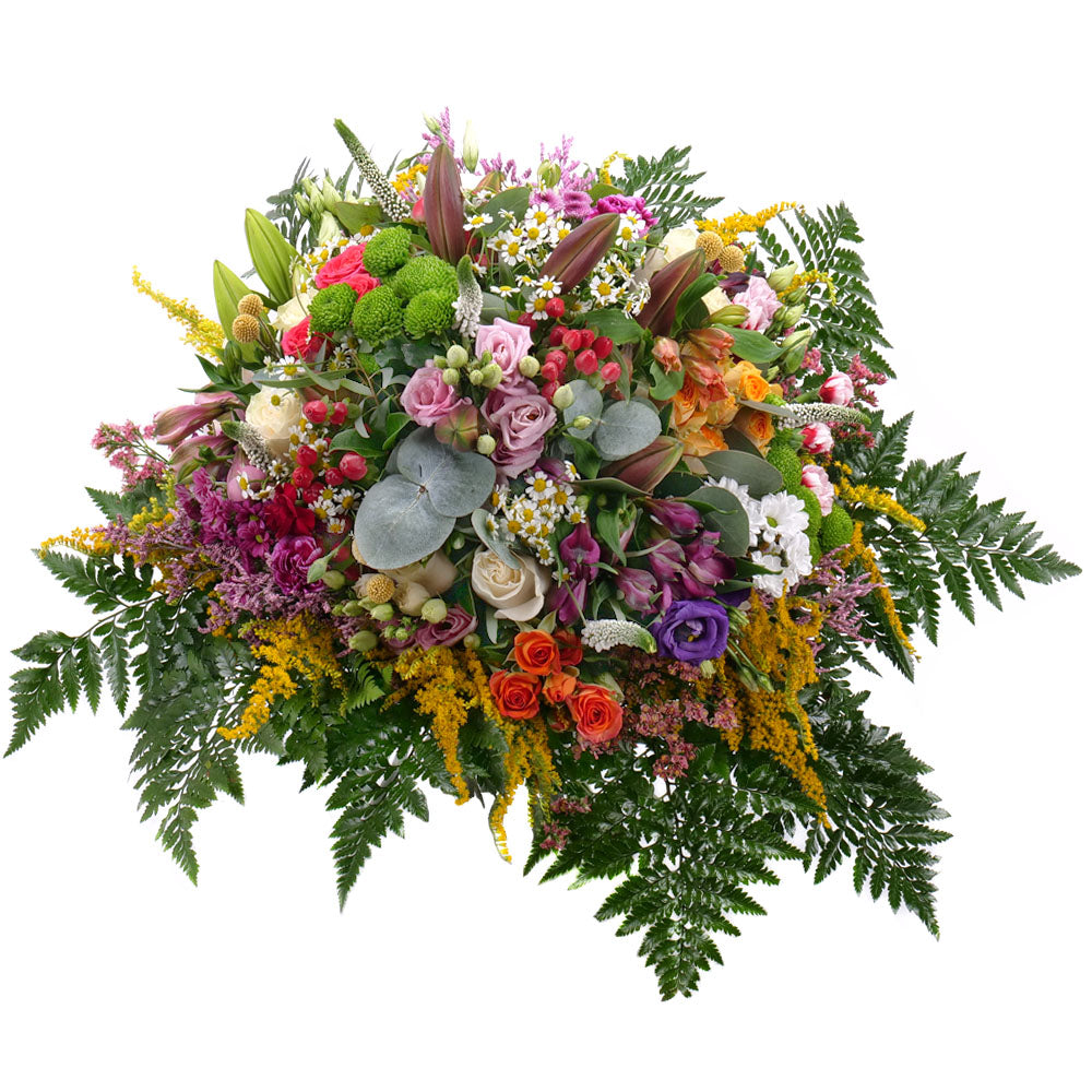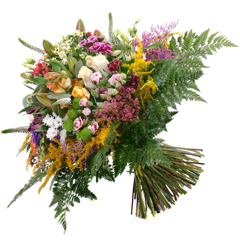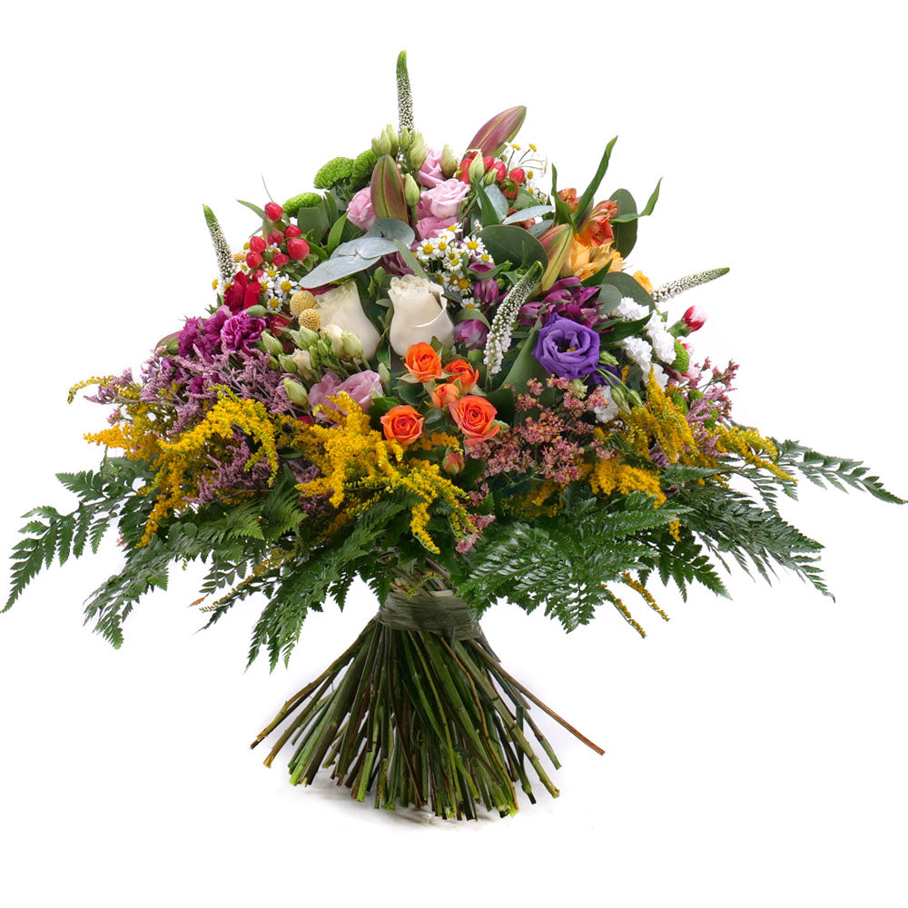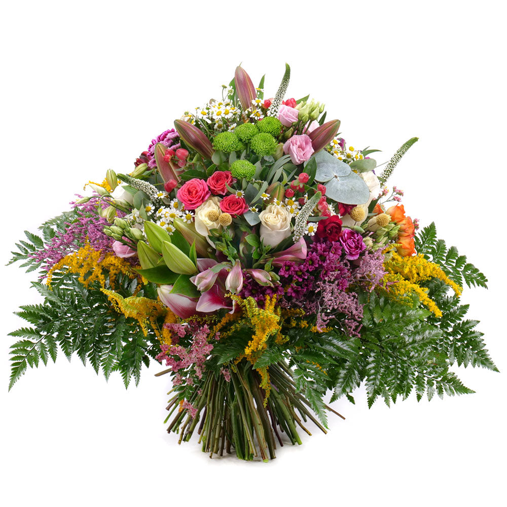 Letana 9 je štýlová kytica aranžovaná z modernej kombinácie ruží, ľalií, chryzantém, karafiátov, rumory, limoniek a iných lúčnych kvetov.