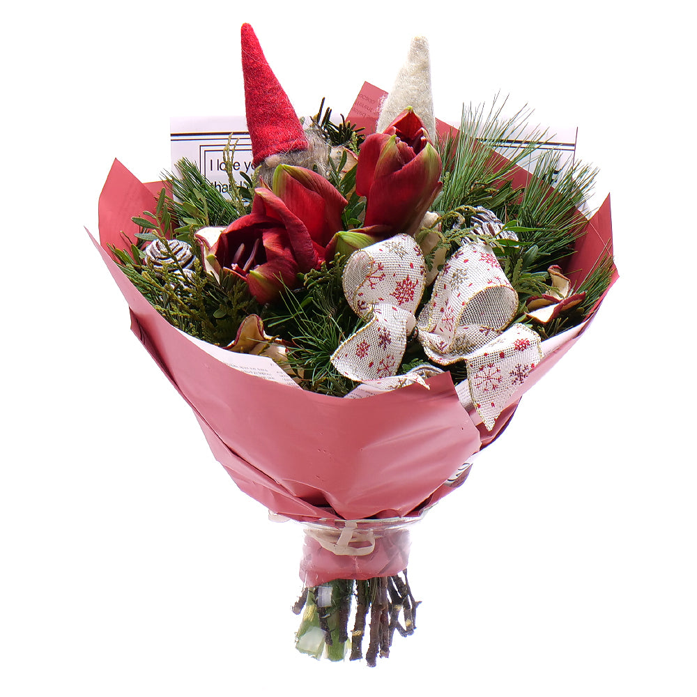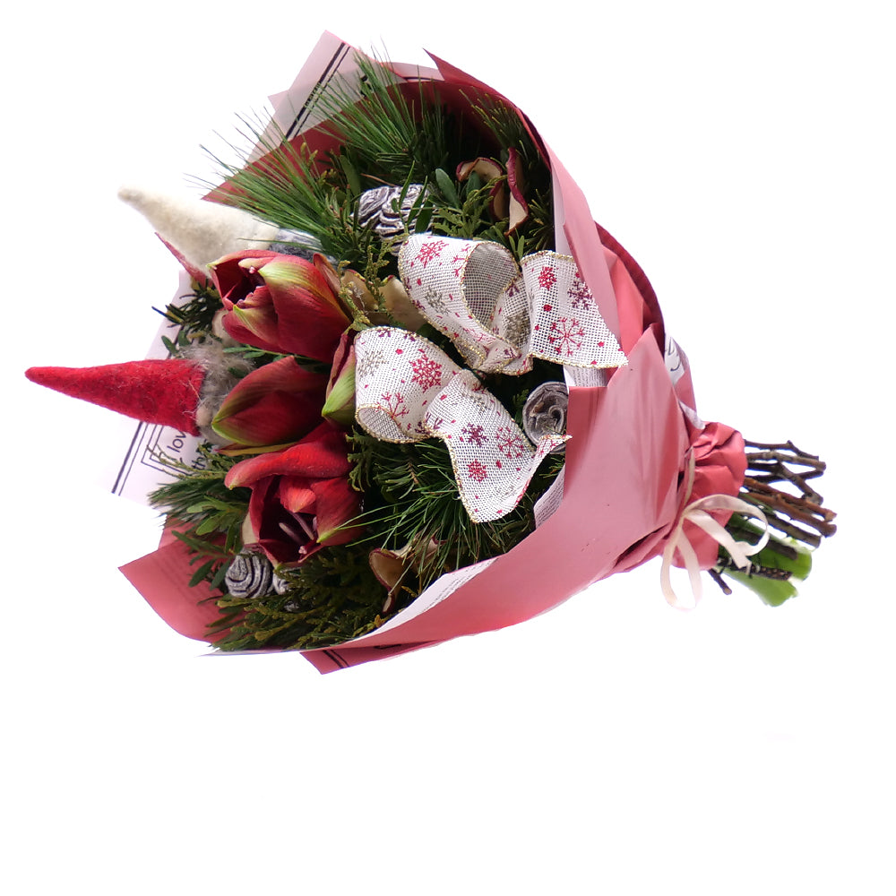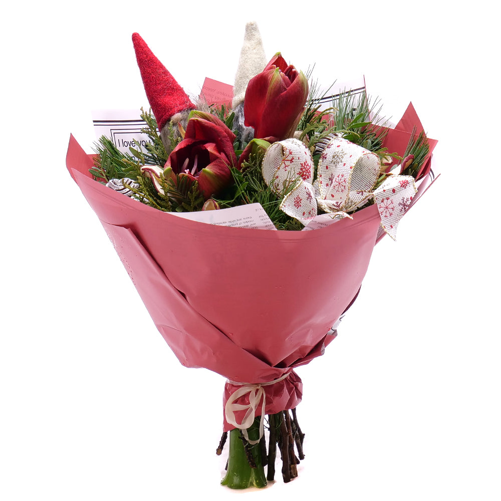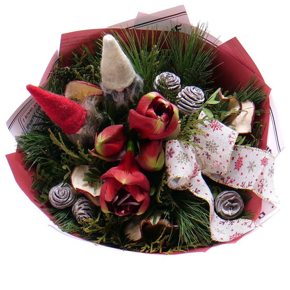 Okrúhla vianočná kytica z červeného amarylisu, dozdobená prírodnými doplnkami a dekoračnými trapslíkmi, ozdobným papierom a stuhou.SloženíAmarylis červený rez - 1... Čítať viac