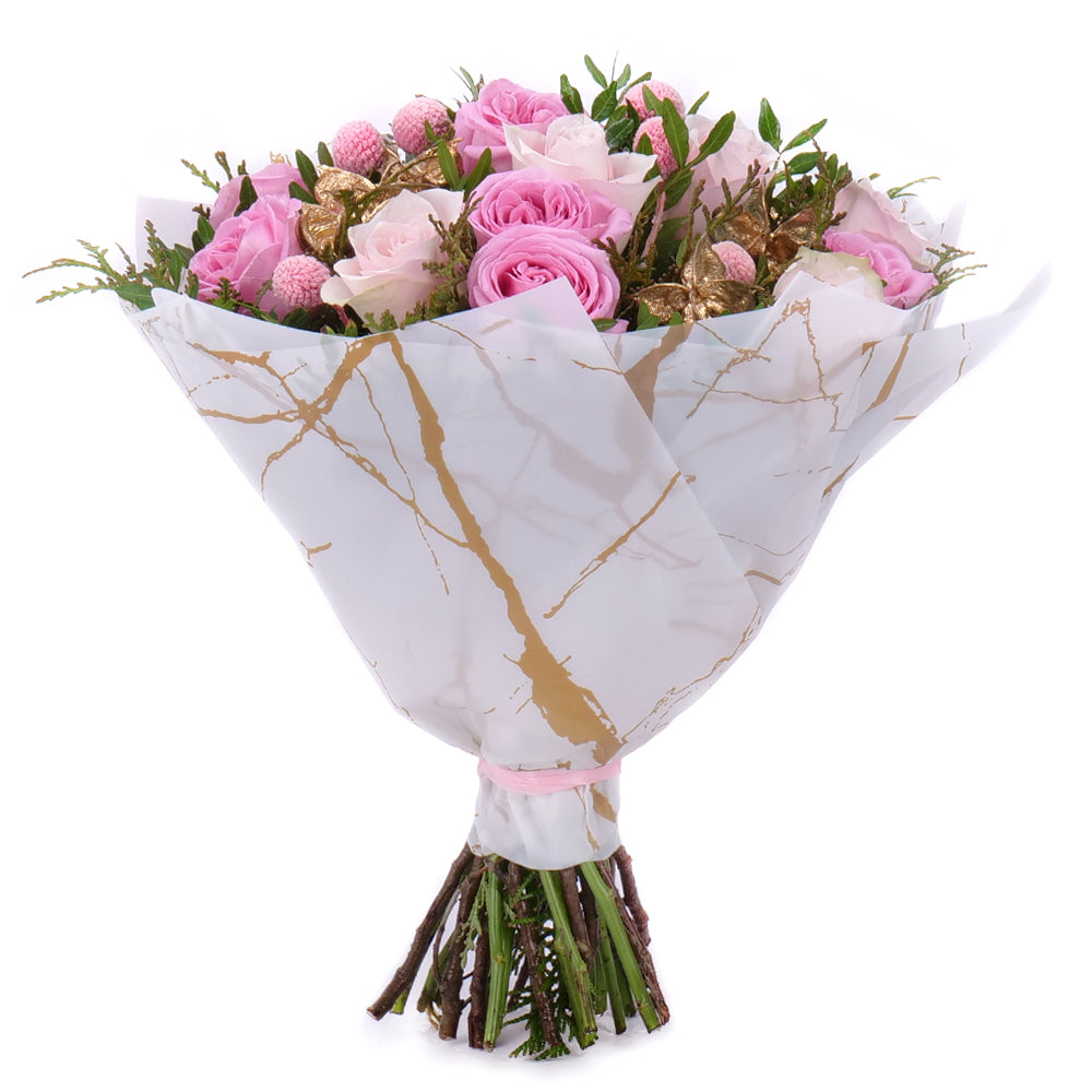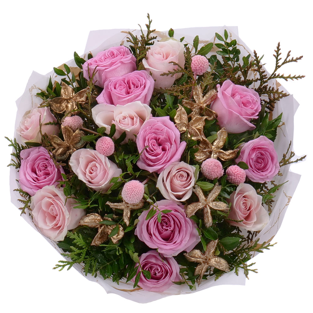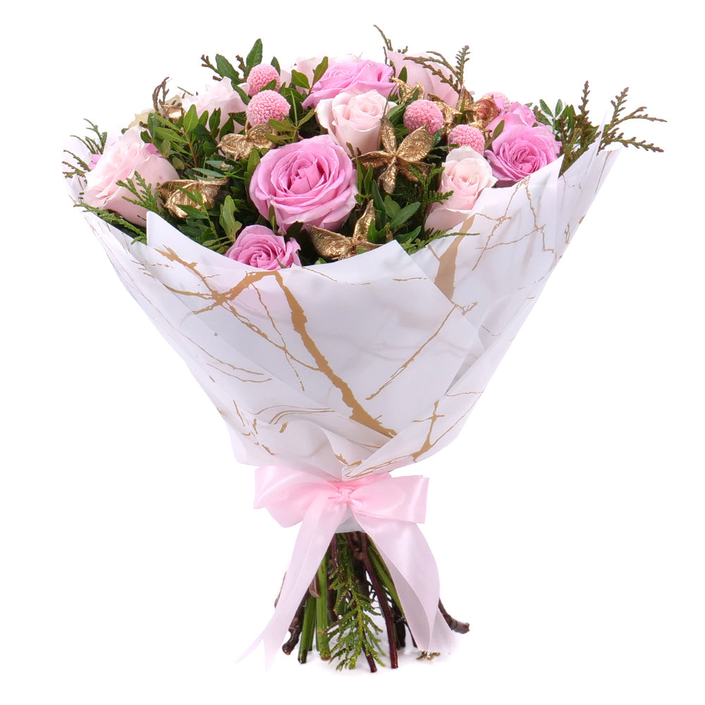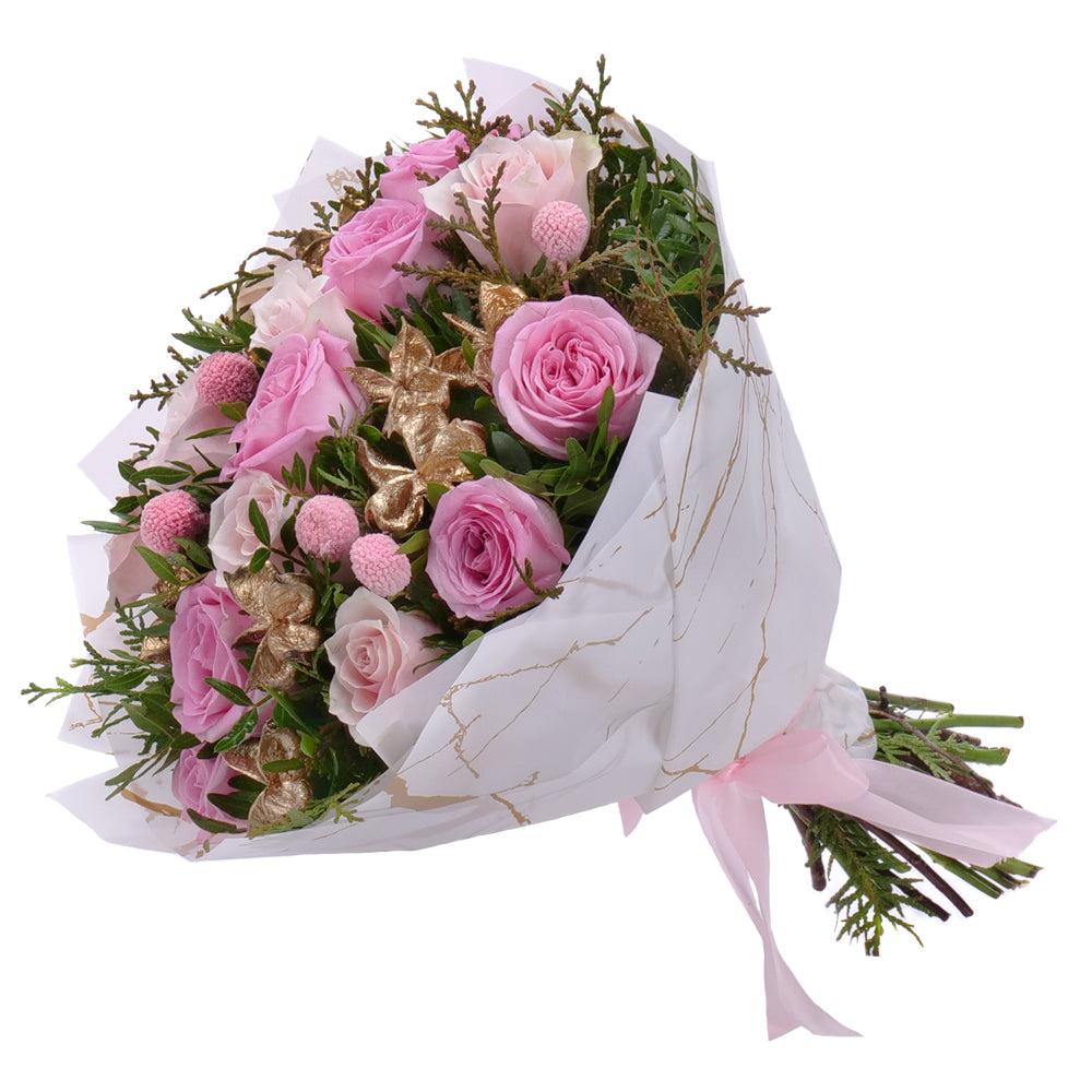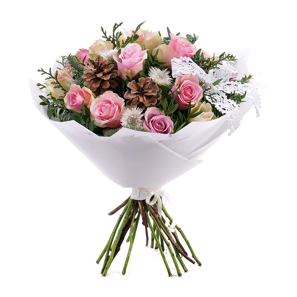 Vianočná kytica z ruží ladená do jemnej ružovej farby s prírodnými doplnkami. Spríjemní Váš domov a prinesie vianočnú atmosféru na štedrovečerný stôl.