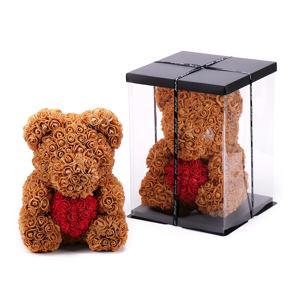 Macko škoricovej farby so srdiečkom z umelých penových ruží je vhodným darčekom na každú príležitosť.