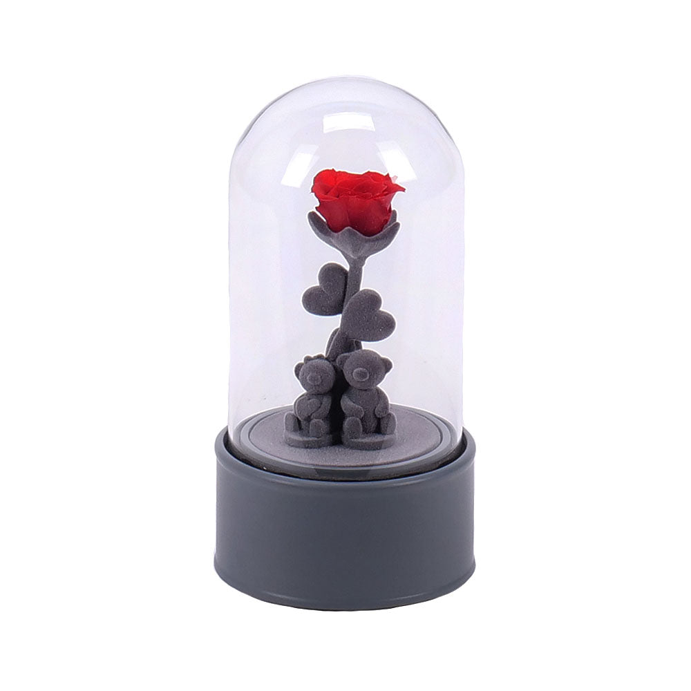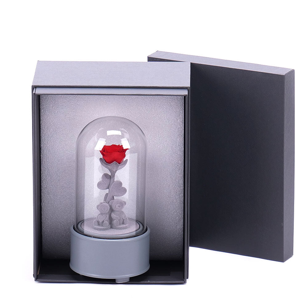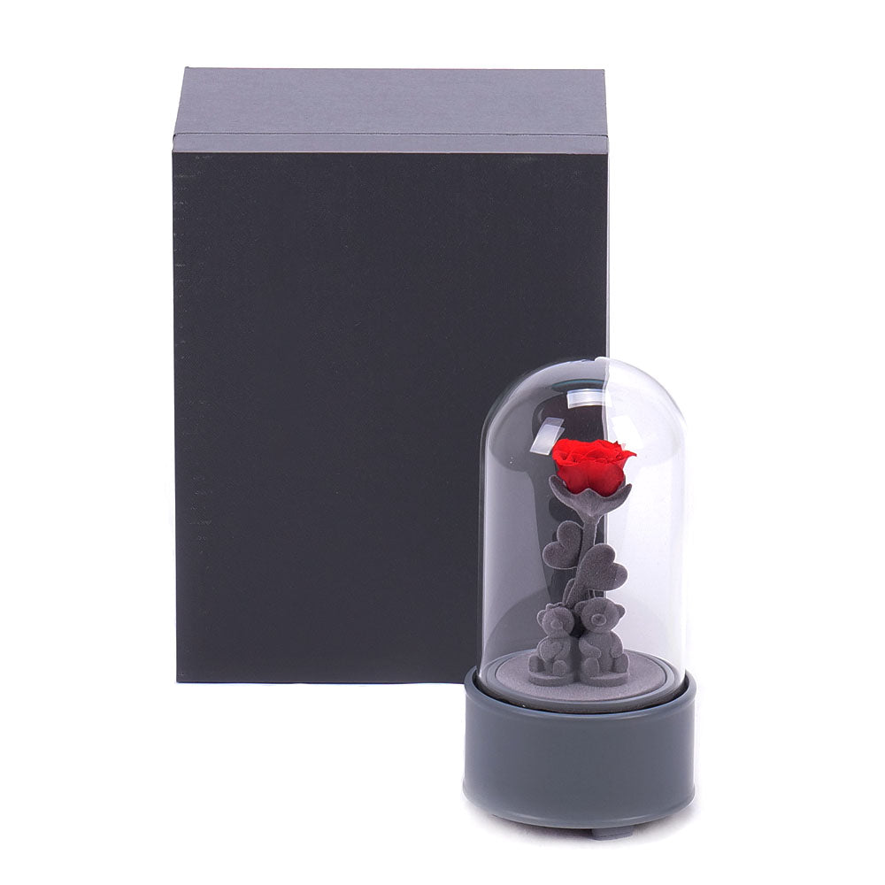 Darčekový medvedík s In eterno preparovanou ružou v sklenenej hracej skrinke. Po natiahnutí skrinka hrá príjemnú melódiu a otáča sa. Súčasťou je elegantné balenie v šedom boxe.