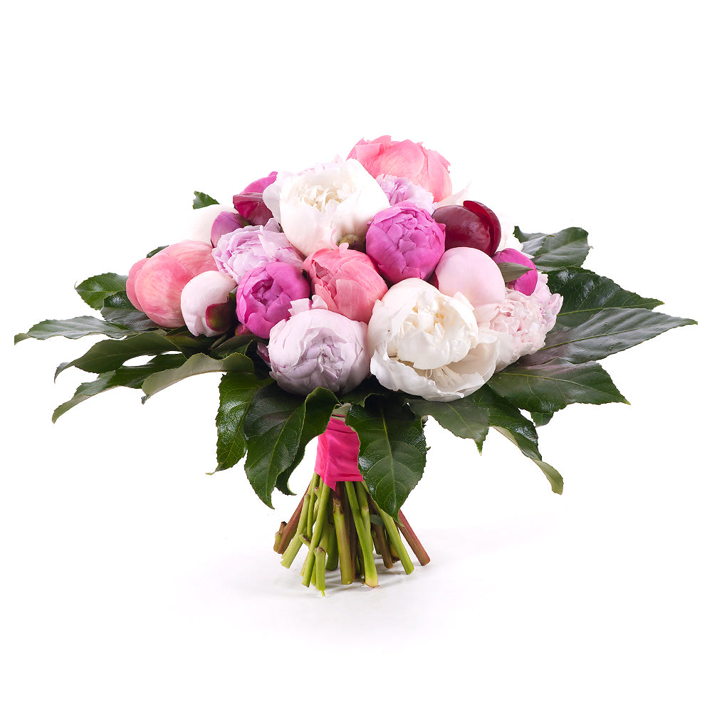 bohatá kytica z 25 farebných pivónií s dekoračnou zeleňou zviazaná výraznou ružovou stuhou. Čítať viac