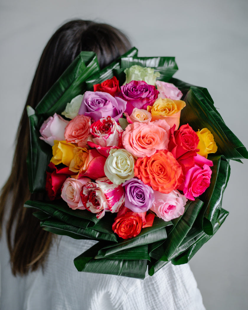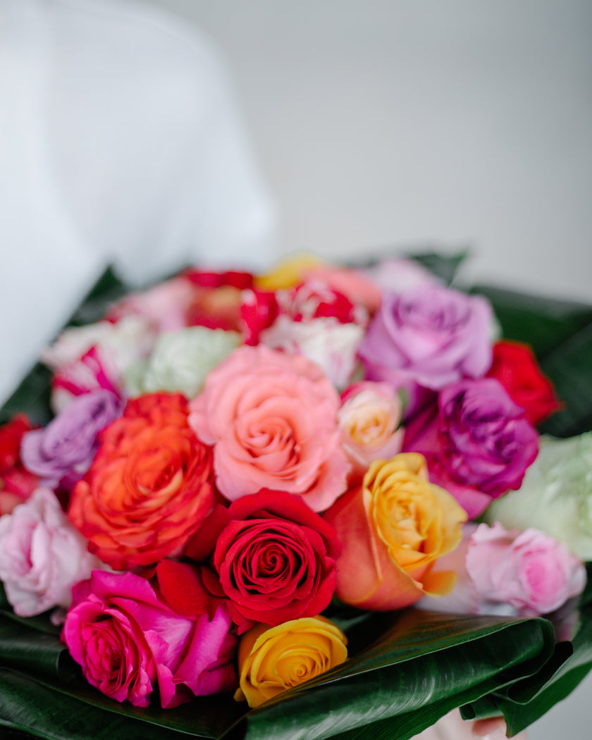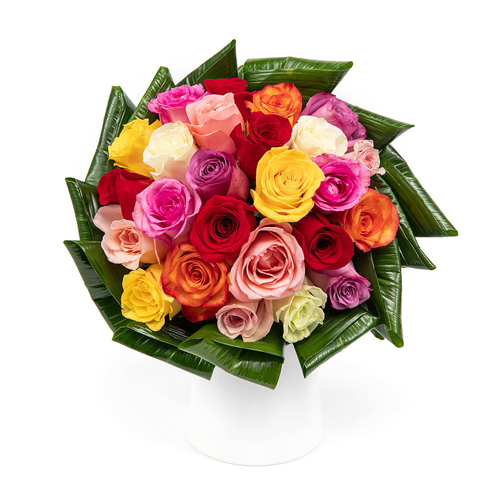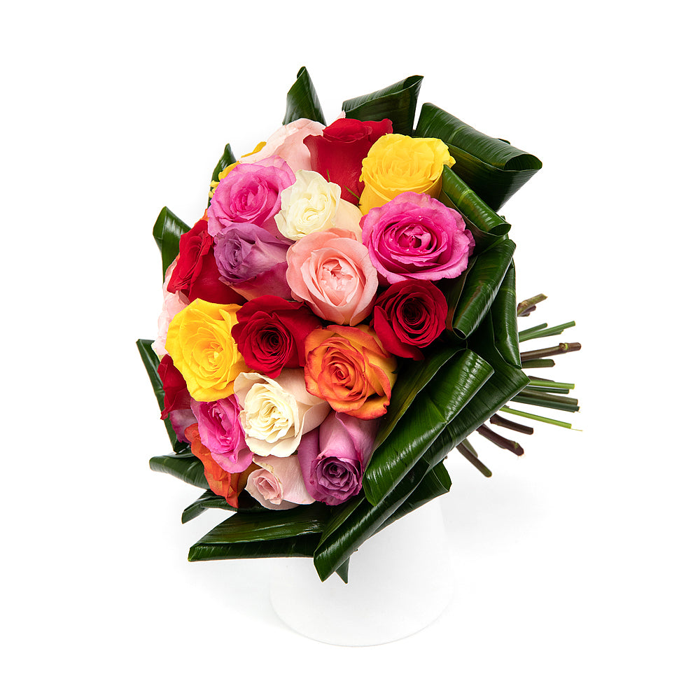 Kytica je aranžovaná z 25 farebných luxusných ruží v ružovej, žltej, oranžovej a červenej farbe.