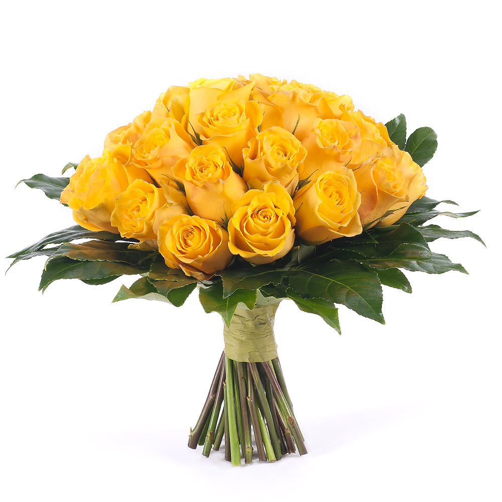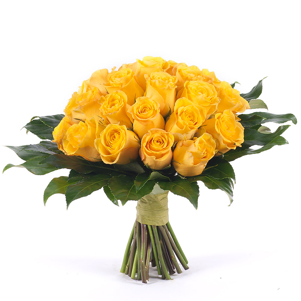 Elegantná okrúhla kytica aranžovaná z luxusných žltých ruží s dekoračnou zeleňou.