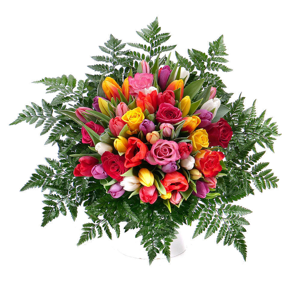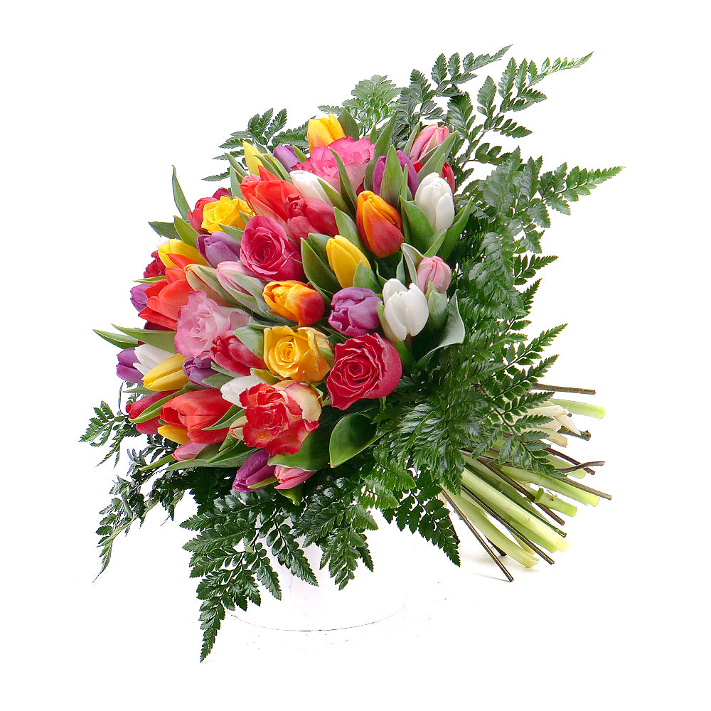 Kytica Perla ruža tulip color vyobrazená na obrázku je aranžovaná z 41farebných tulipánov a 9 farebných ruží. Doplnená je dekoračnou zeleňou. Počet tulipánov v kytici je možné navýšiť.