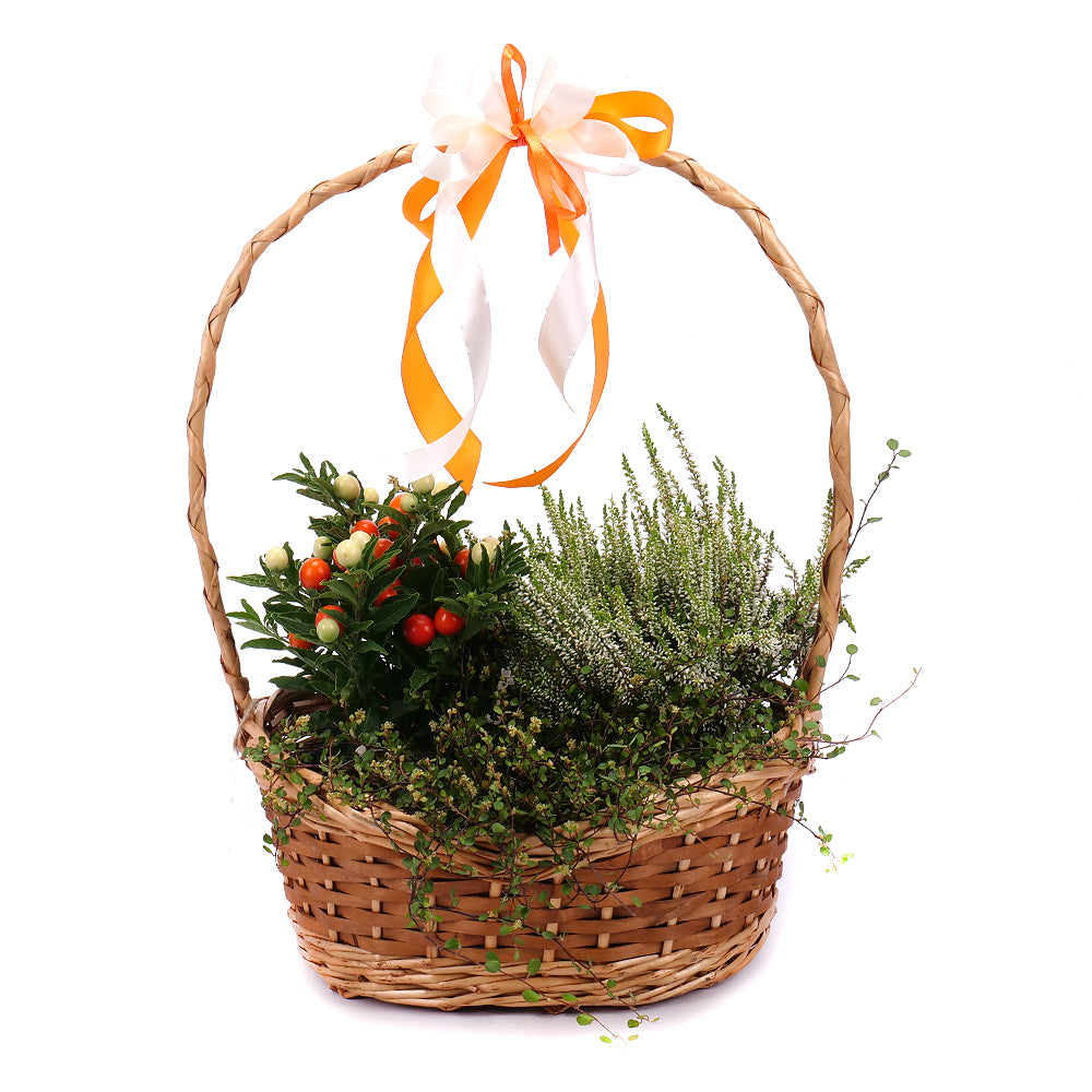 Darčekový prútený kôš s jesennými kvetmi - vres - 1 ks, solamum - 1 ks a muehlenbeckia - 1 ks. Čítať viac