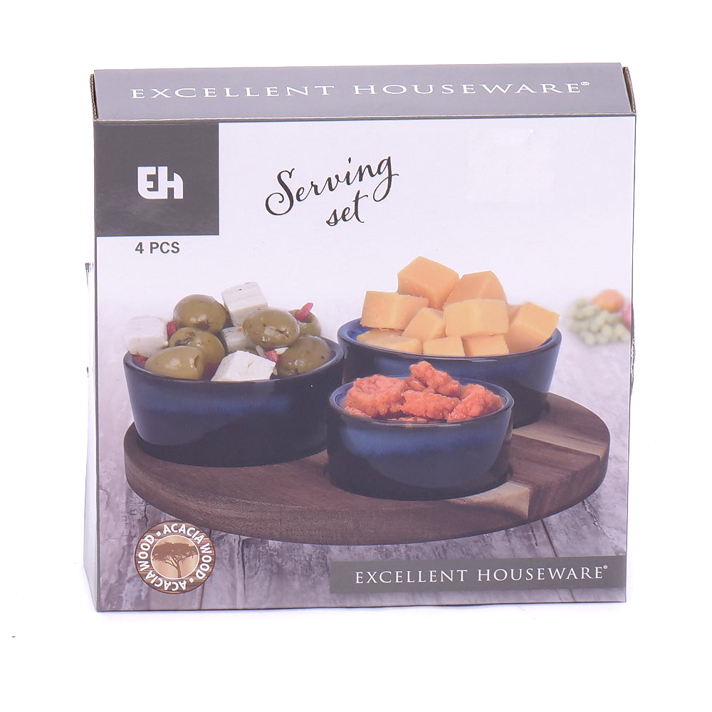 Servírovací set zložený z drevenej podložky - 1 ks, keramických misiek - 3 ks rôznych veľkostí.