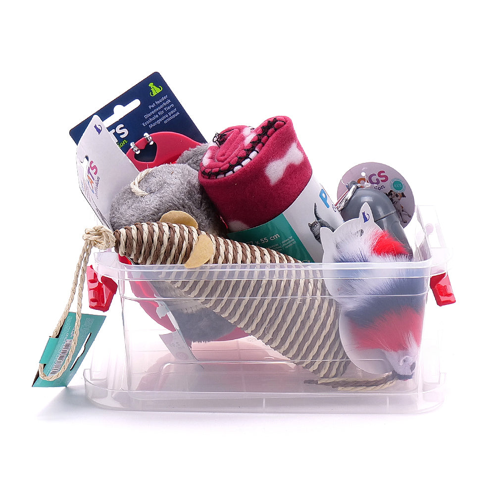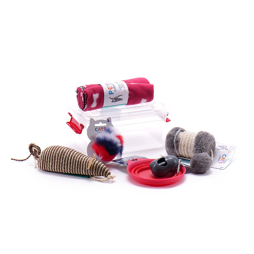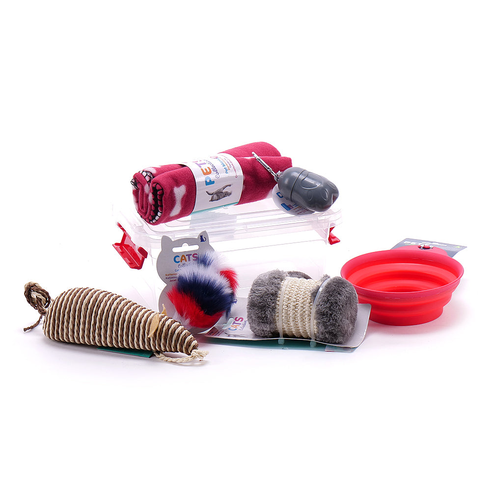 Praktický darček pre mačku - skladacia miska - 1 ks, hračka pre mačku - 3 ks, deka pre domáce zviera - 1 ks, úložný plastový box - 1 ks.