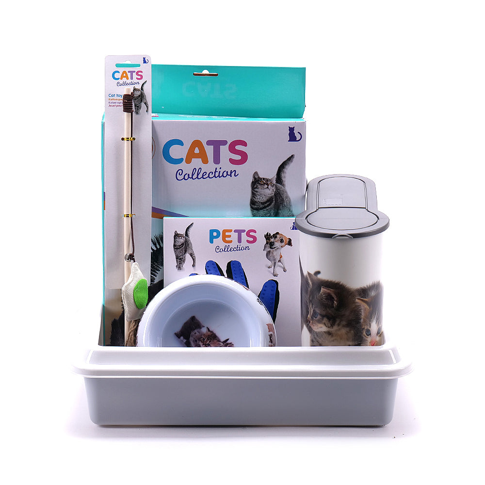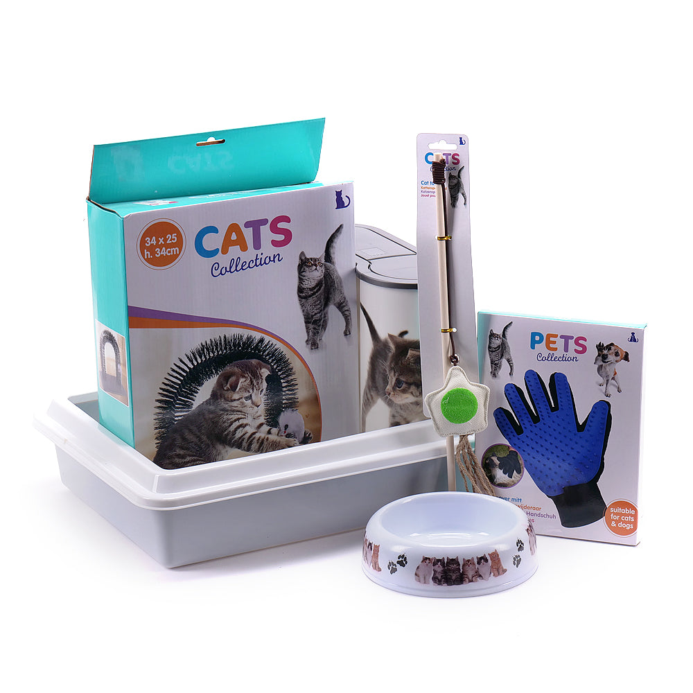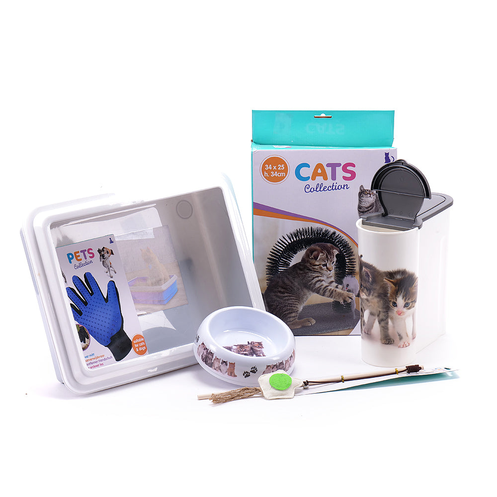 Set pre mačku obsahuje: hračka pre mačku - 1 ks, rukavica na česanie domácich zvierat - 1 ks, miska pre mačku platová - 1 ks, toaleta pre domáce zviera - 1 ks, nádoba na krmivo pre zvieratá - 1 ks, set na hranie pre mačky - 1 ks.