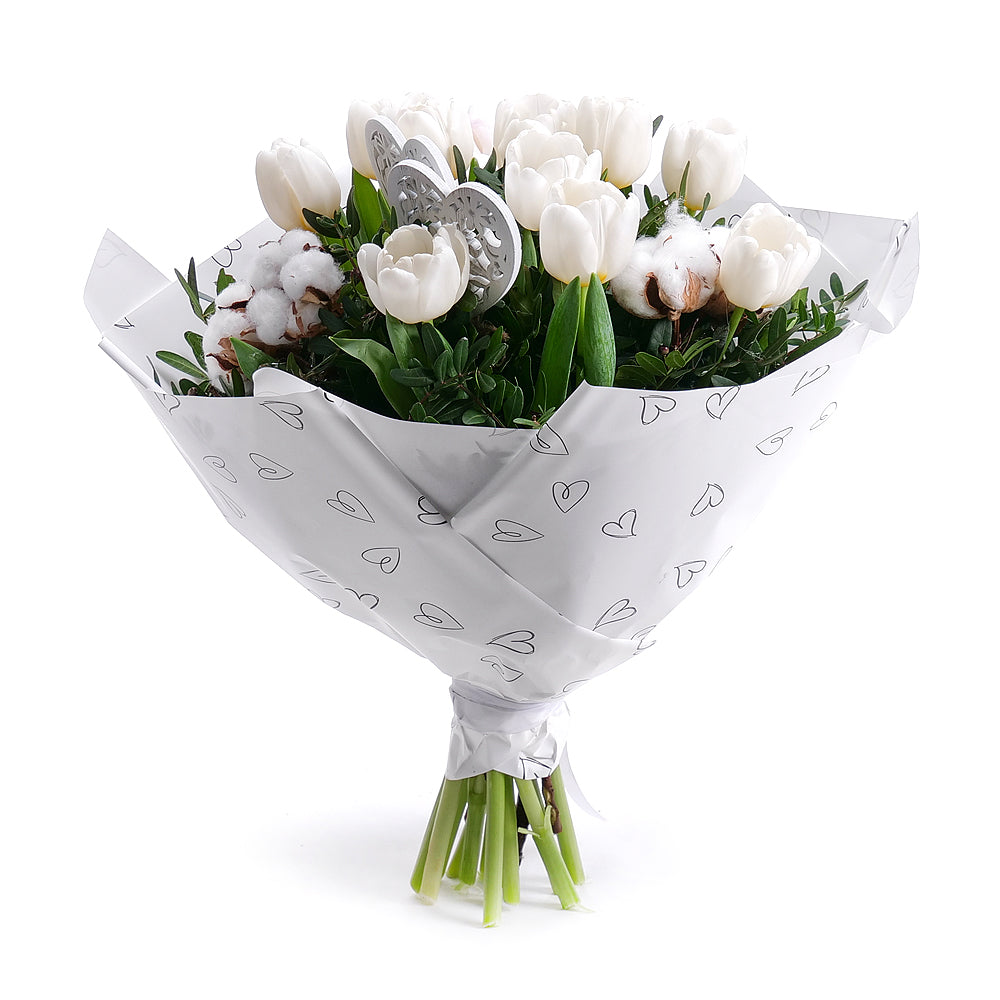 Kytica bielych tulipánov s dekoračnými srdiečkami, prírodnými doplnkami a ozdobným papierom.