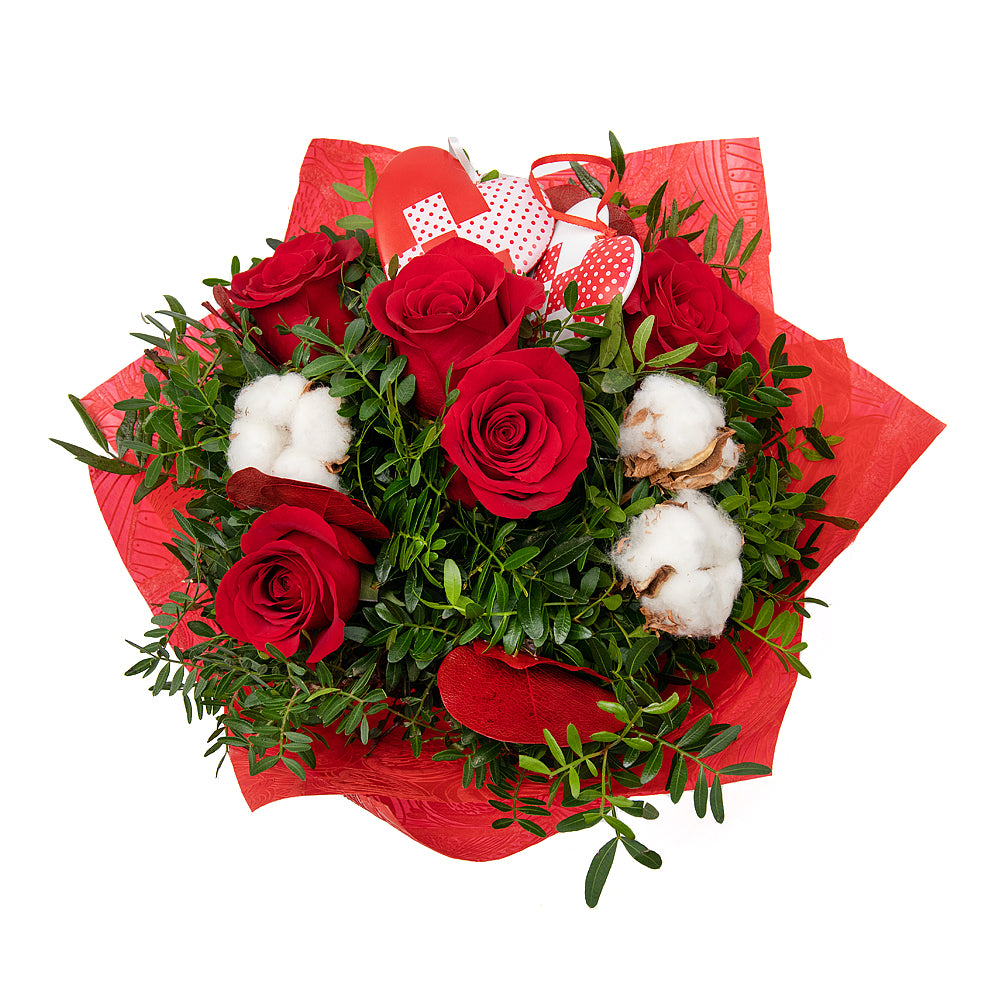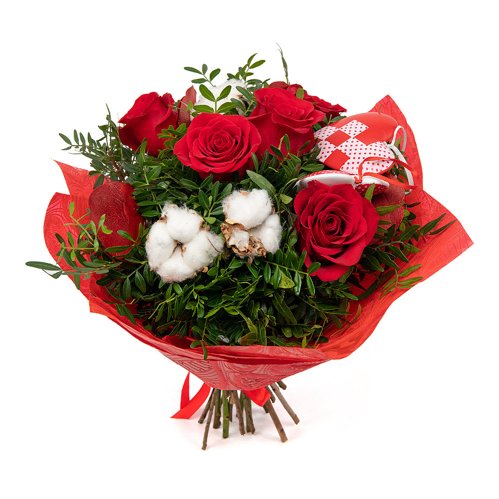 Kytica z červených ruží doplnená bavlníkom, dekoračnou zeleňou a srdiečkami v ozdobnom papieri. Čítať viac