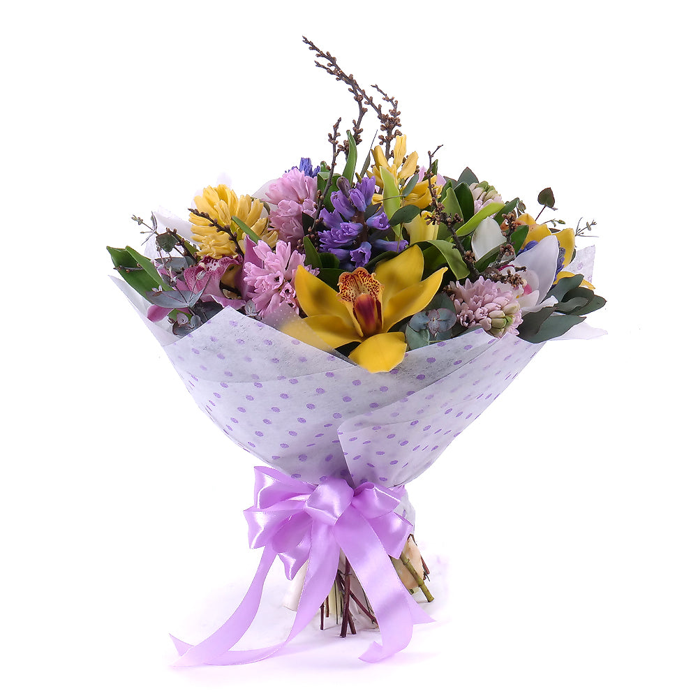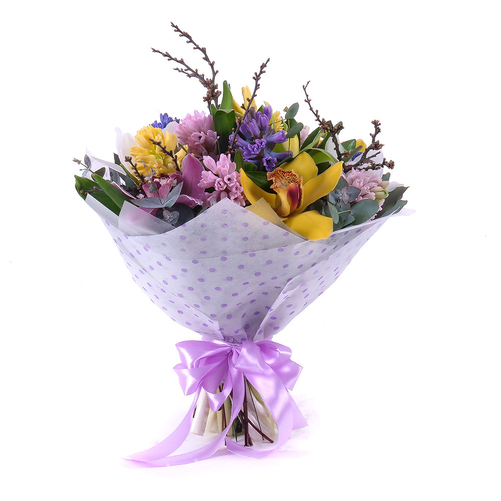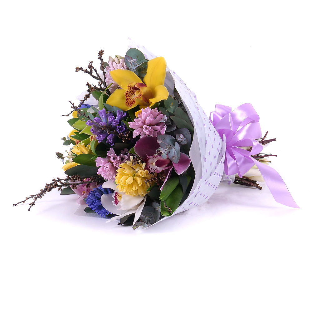 Pestrá jarná kytica z hyacintov rezaných cymbídií a dekoračnej zelene.