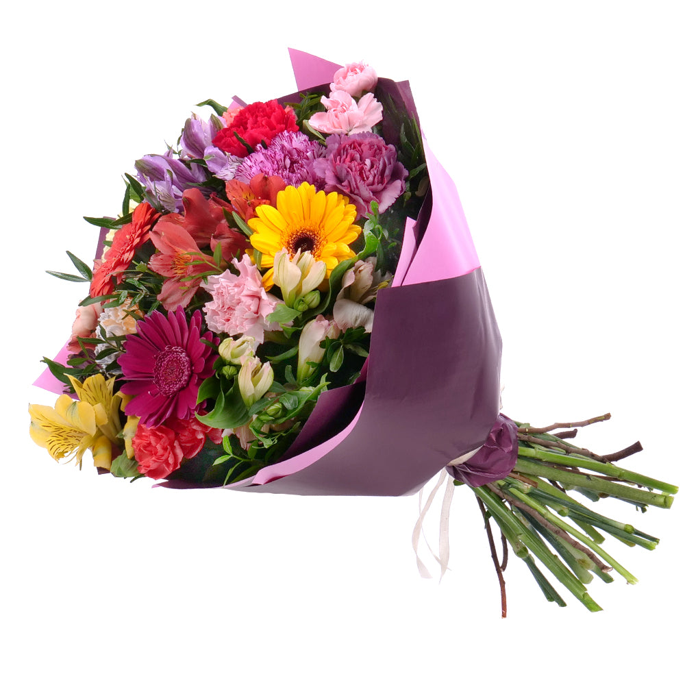 Pestrofarebná kytica z gerbier, farebných karafiátov a alstromérií. Čítať viac