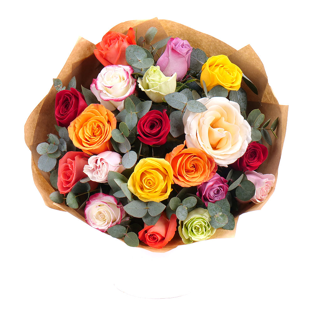 Luxusná kytica z farebných ruží doplnená eukalyptom. Je balená v prírodnom papieri so saténovou stuhou. Čítať viac