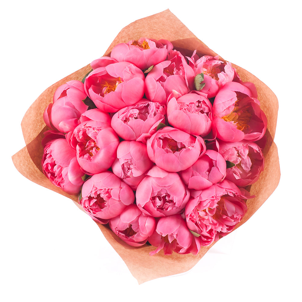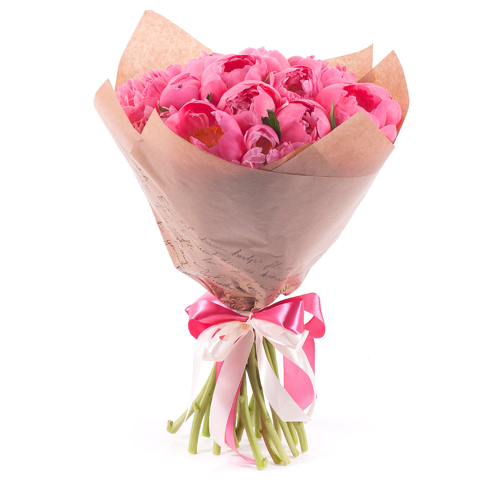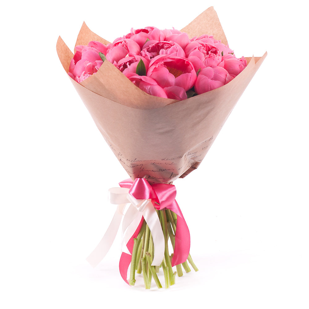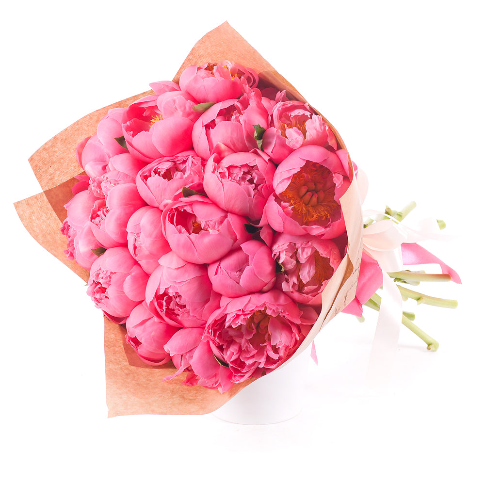 Kytica z 19 koralových pivónií v ozdobnom papieri so saténovou stuhou.