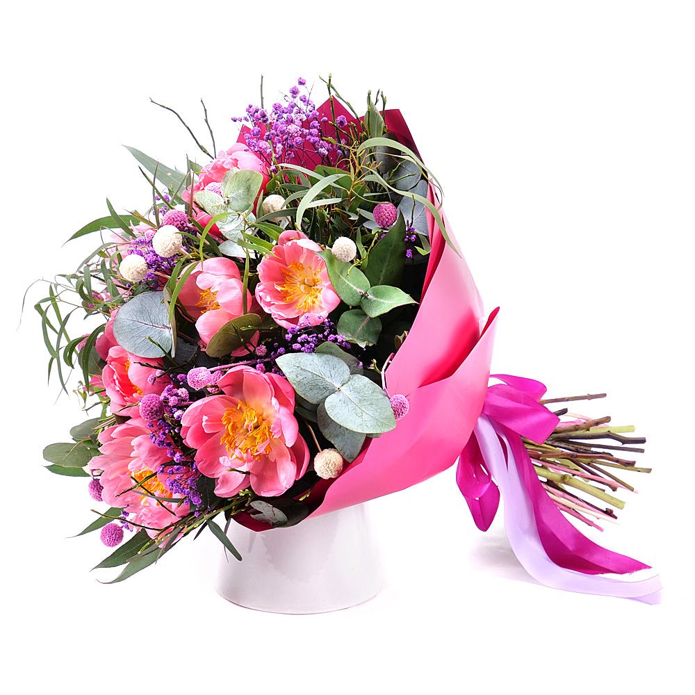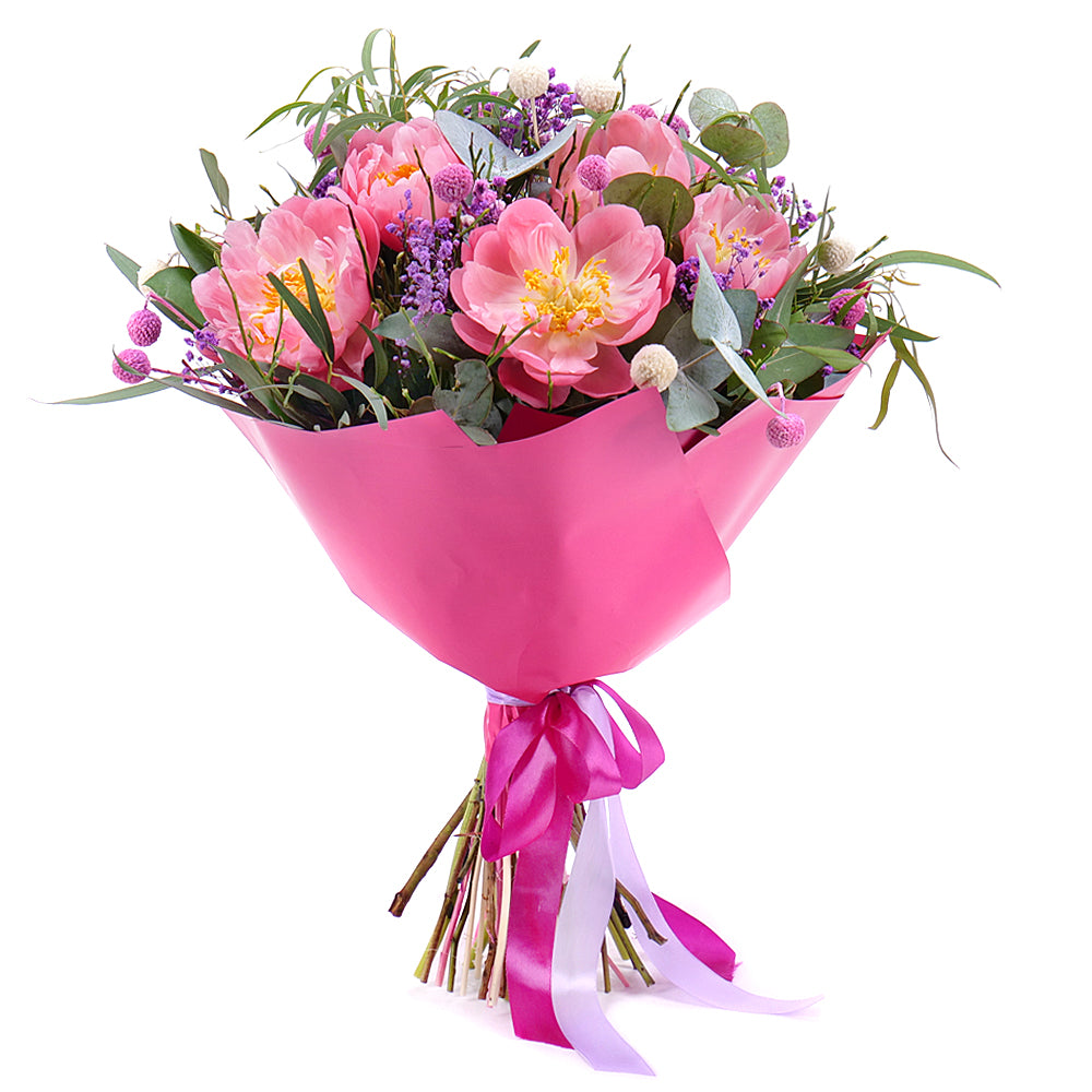 Kytica z pivónií kombinovaná s dekoračnou zeleňou, ozdobným papierom a stuhou.