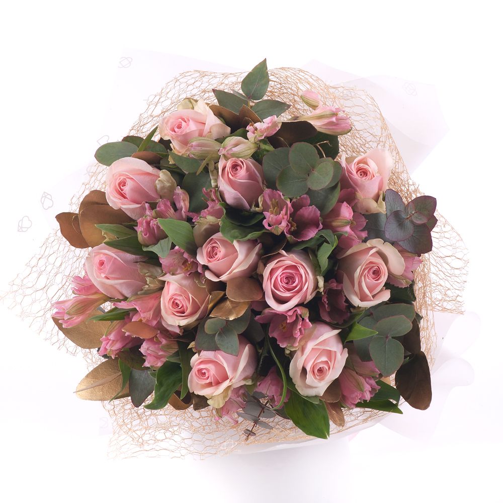 Sweet ružové ruže a alstromérie s eukalyptom