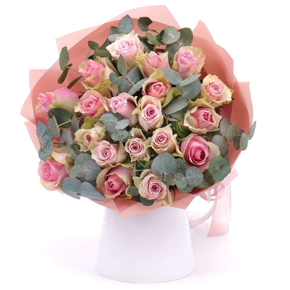 Okrúhla kytica z 19 melírovaných ružových ruží s eukalyptom v ozdobnom papieri so saténovou stuhou. Čítať viac