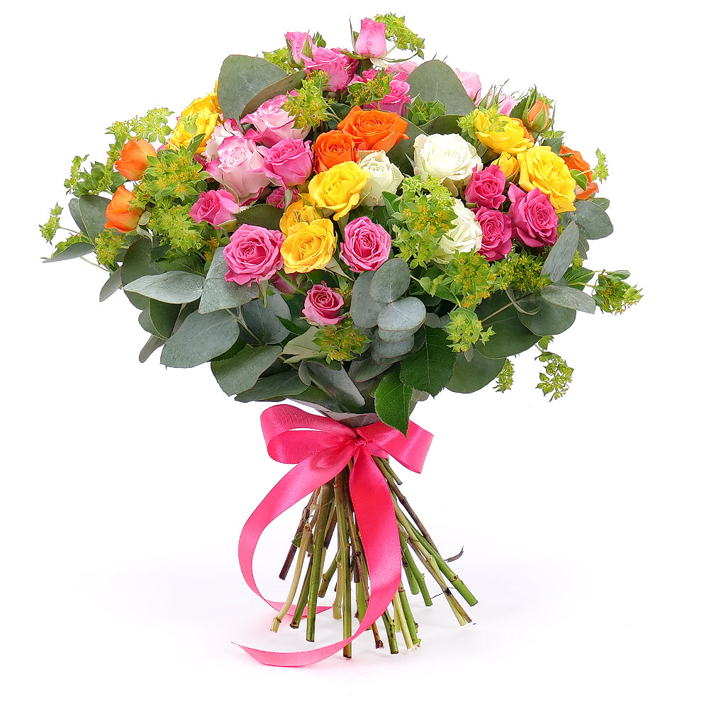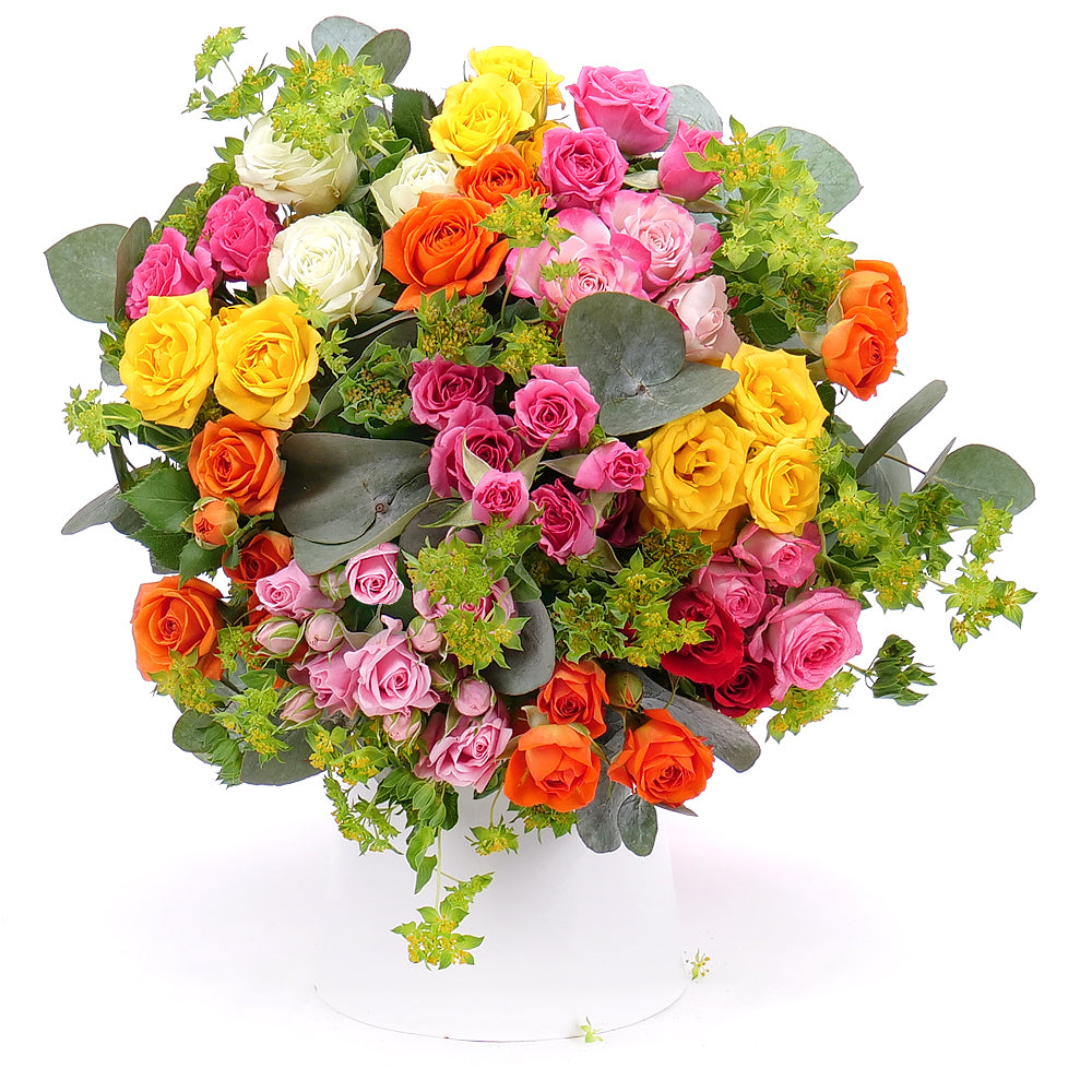 Okrúhla kytica z 15-tich farebných trsových ruží doplnená alchemilkou a voňavým eukalyptom.