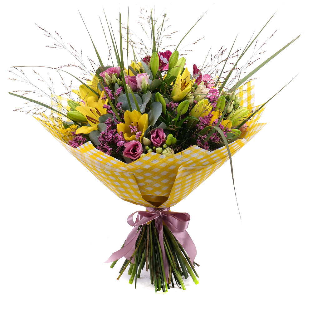 Svieža a žiarivá kytica je dokonalým spojením jemnosti a energie. Dominantné žlté ľalie prinášajú slnečnú radosť a optimizmus, zatiaľ čo ružový lisiantus vnáša do kompozície nežnosť a romantiku. Eukalyptus dodáva kytici moderný nádych a sviežu vôňu, limon