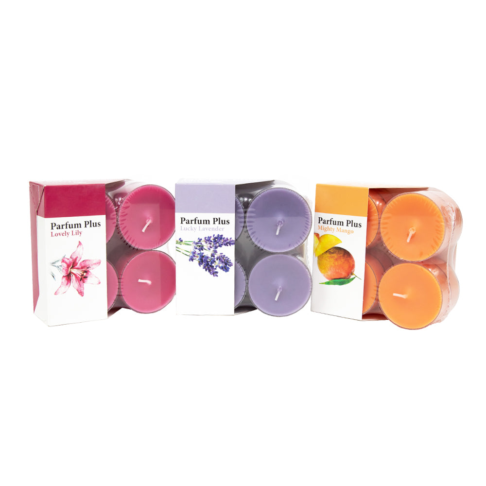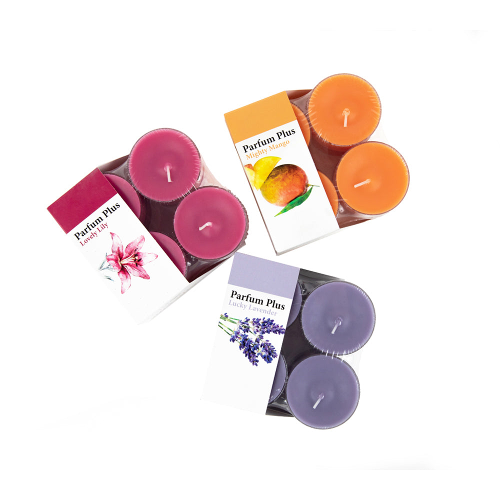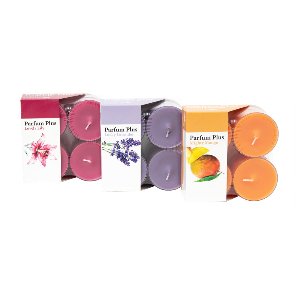 Tri sady čajových sviečok s vôňou manga, levandule a ľalie. Jedna sada obsahuje 8 ks veľkých čajových sviečok.