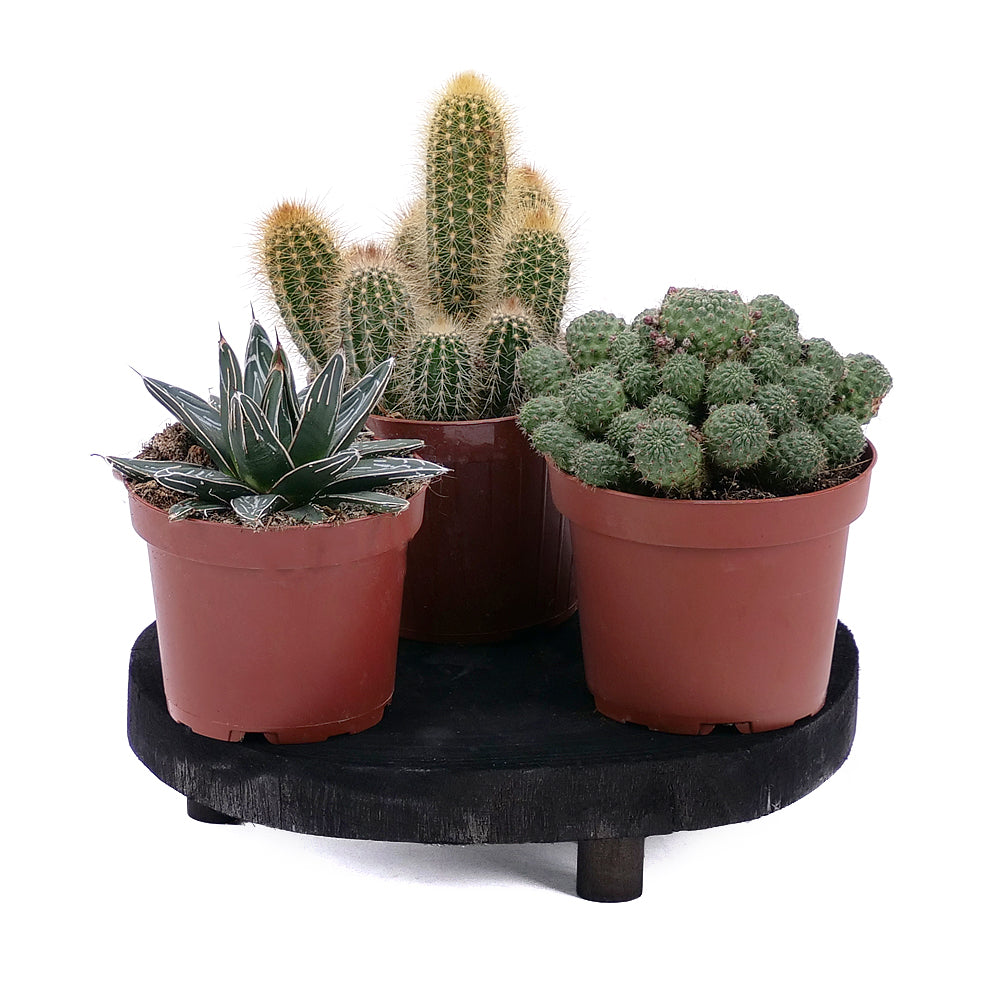 Mix kaktusov v plastových črepníkoch na drevenej podložke s nôžkami. Kolekcia poteší každého milovníka kaktusov. Čítať viac