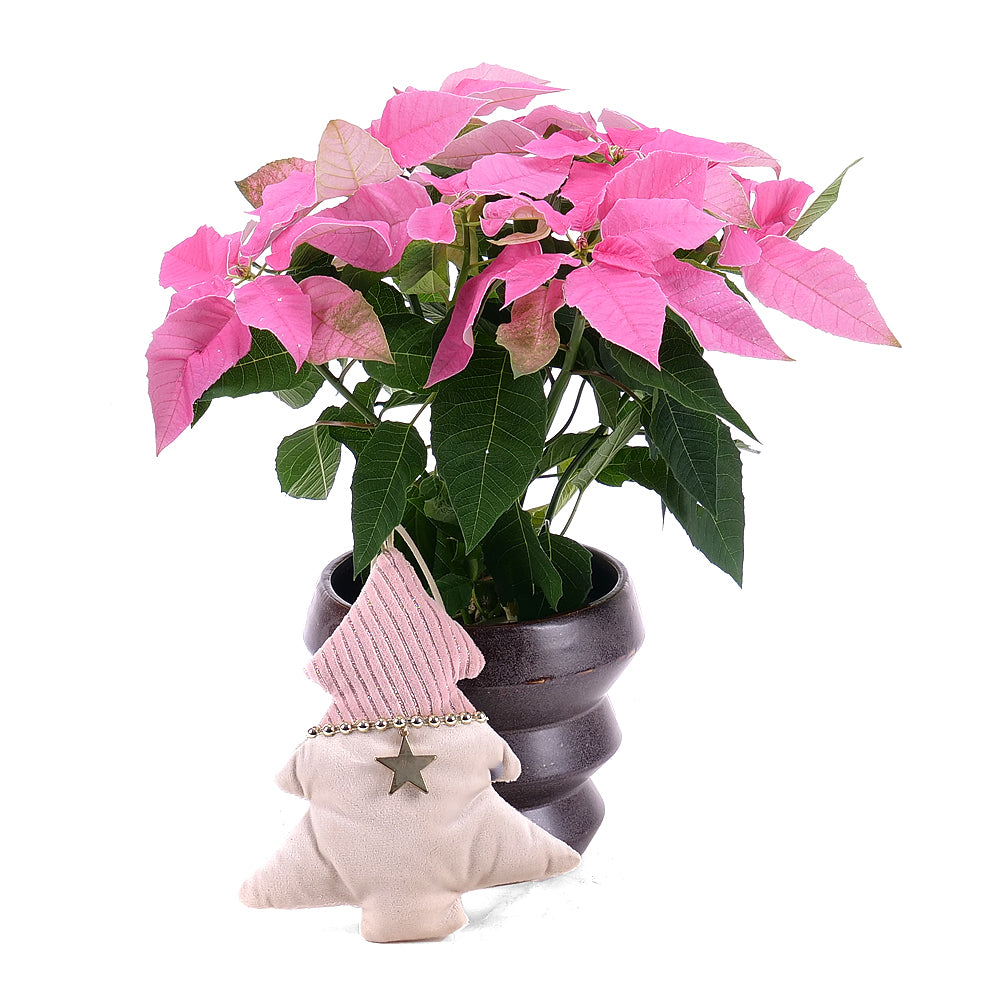 Živá vianočná ružová črepníková ruža v dekoračnom keramickom obale s pyšovou dekoráciou stromčeka na zavesenie.