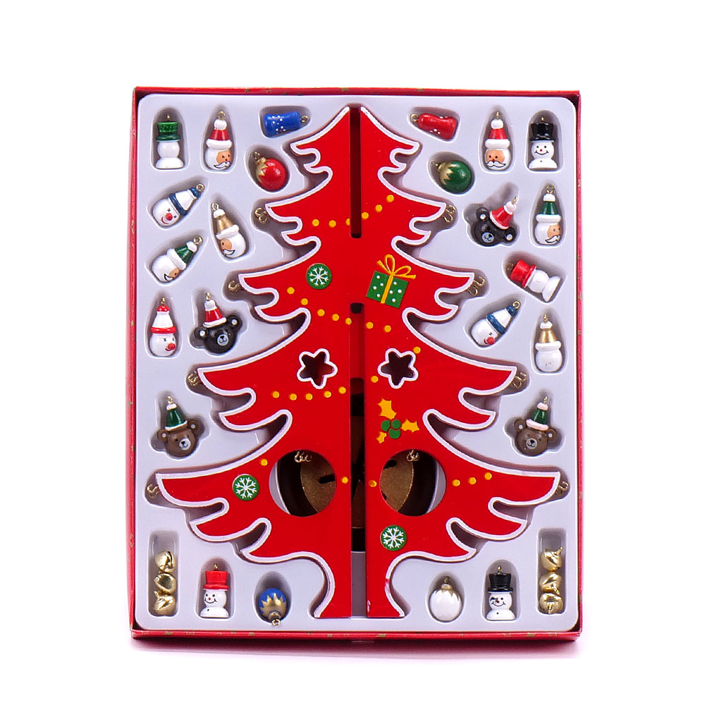 Vianočná dekorácia v podobe dreveného vianočného stromčeka s mini ozdobami na zavesenie.