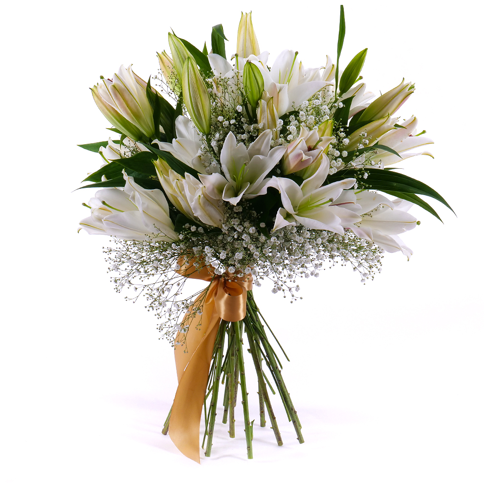 Jemná, elegantná kytica z bielych ľalií, doplnená gypsomilkou a saténovou stuhou. Určite poteší všetkých milovníkov ľalií.