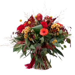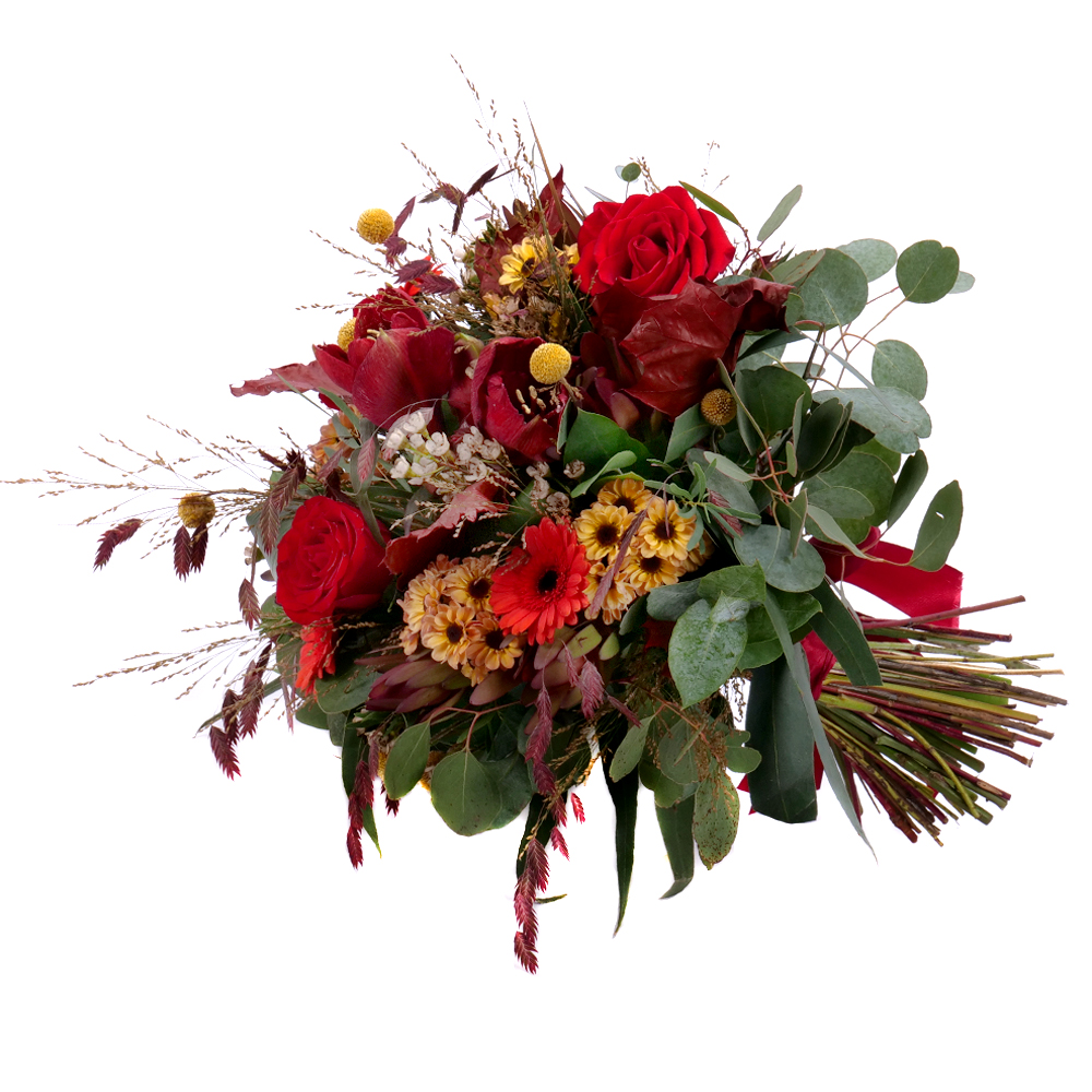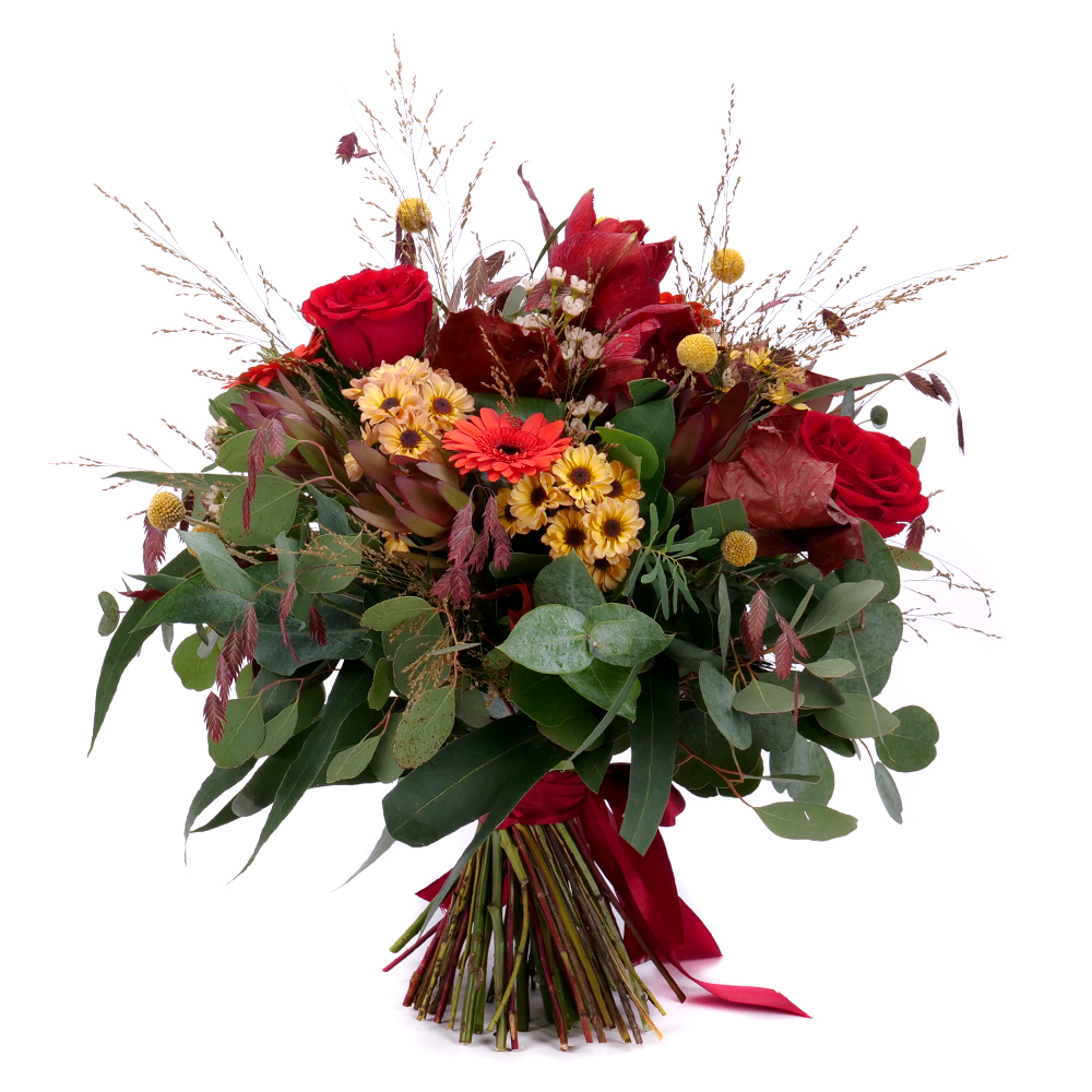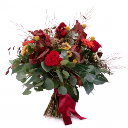 Elegantná a vznešená kytica z červených ruží, gerbier, amarylisu, prírodných doplnkov, tráv a dekoračnej zelene. Kytica je doplnená saténovou stuhou. Ideálna voľba ako darček k sviatku menín, narodením alebo k výročiu.