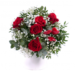 Kytica z červených ruží s dekoračnou zeleňou, gypsophilou a srdiečkami, doplnená saténovou stuhou. Potešíte Vašich drahých nielen na sviatok ale aj vo všedný deň.