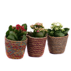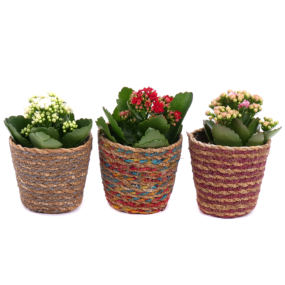 Mini živé kalanchoe v prútenom obale - 3 ks. Kalanchoe je interiérová kvitnúca rastlina v rôznych farbách.
