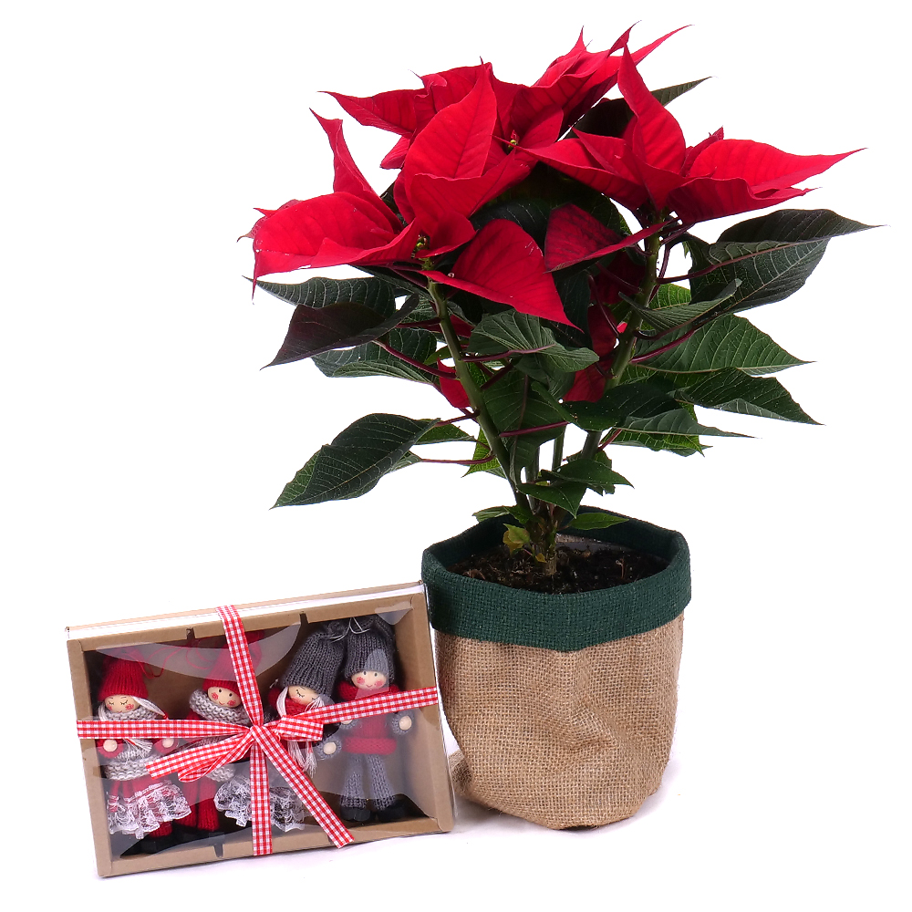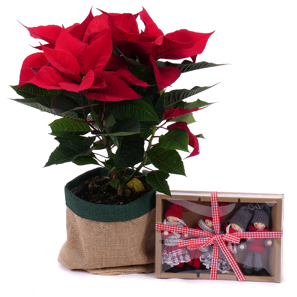 Živá vianočná ruža v dekoračnom obale. Súčasťou setu je sada vianočných ozdôb v podobe mini postavičiek.
