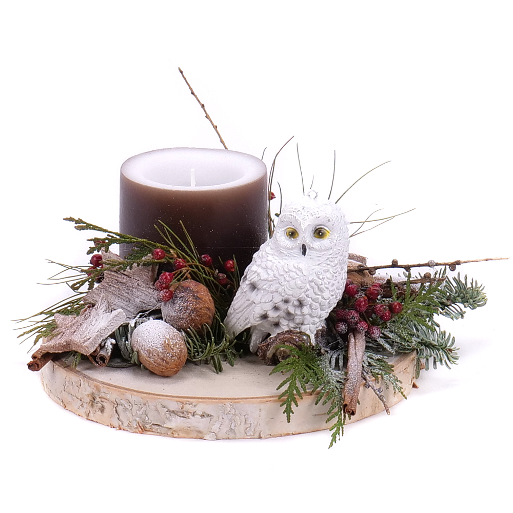 Sviatočný aranžmán na vianočné obdobie na drevenom podklade so sviečkou, prírodnými materiálmi, živou neopadavou čačinou a keramickou sovou. ... Viac