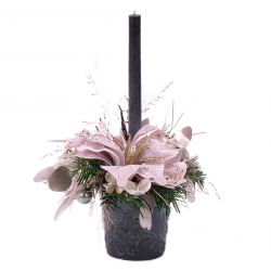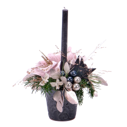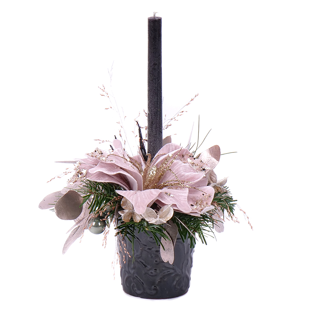 Sviatočný vianočný aranžmán v keramickom obale s kónickou čiernou sviecou a staro - ružovými doplnkami, guľami a živou čačinou. Vhodná dekorácia na sviatočný stôl alebo stolík v obývačke.