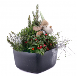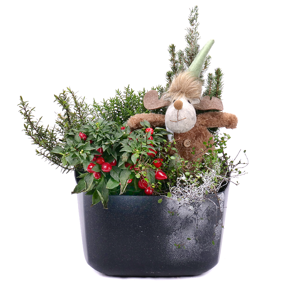Dekoračná zimná výzdoba v podobe živých rastlín - stromčeka conica - 1 ks, Muehlenbeckie - 1 ks, okrasnej papriky - 1ks a vždy zelenej rastliny hebe - 1 ks. Súčasťou je plyšový sob a plastový dekoračný obal.